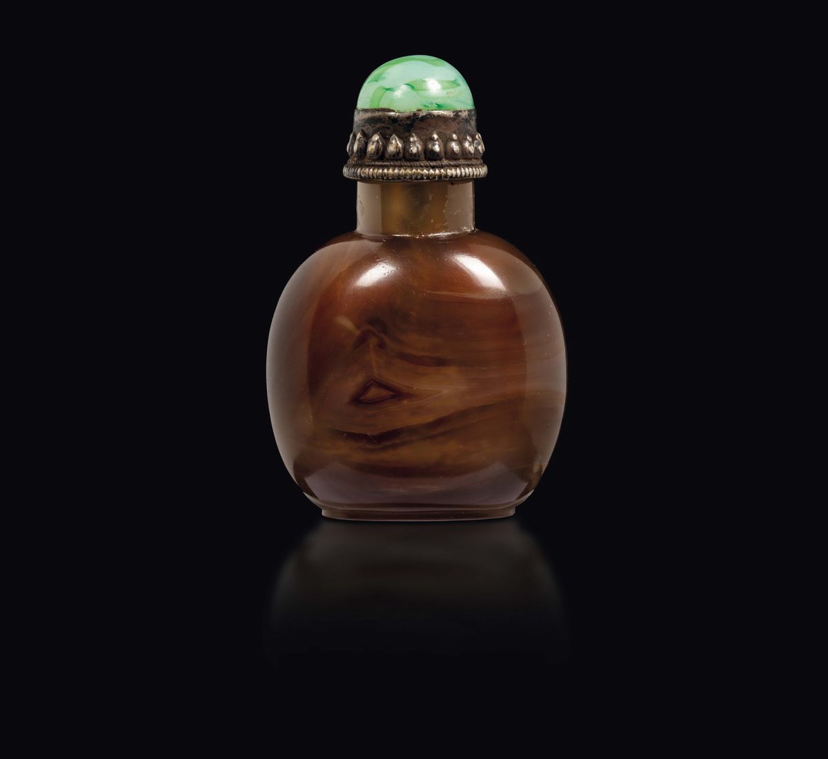 A brown agate snuff bottle with silver stopper, China, Qing Dynasty, 19th century