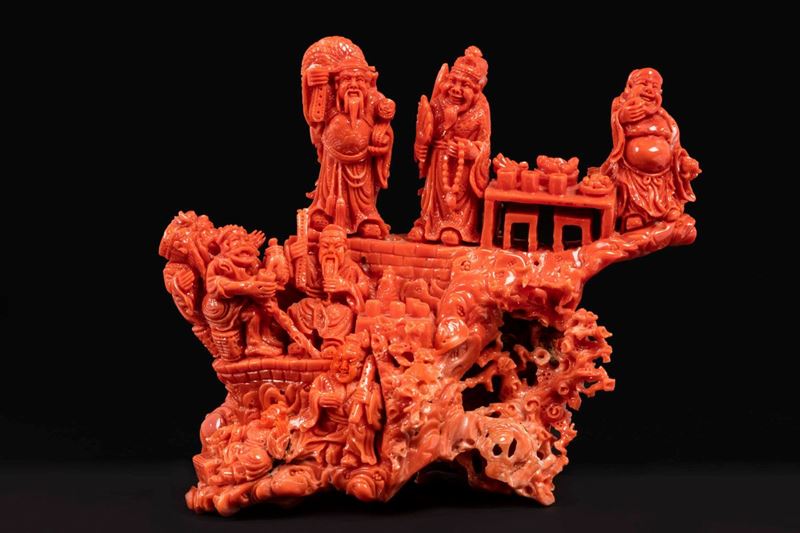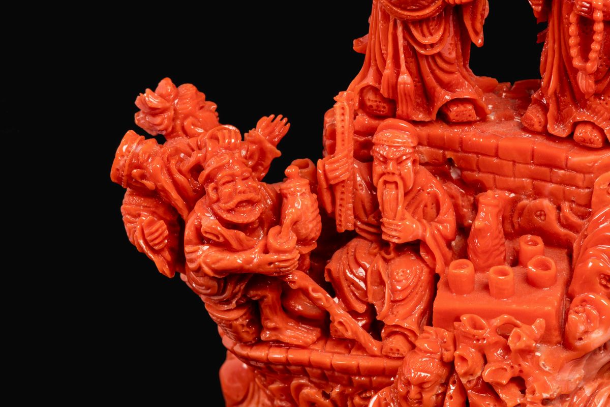 A carved coral group with common life scenes and dragons, China, early 20th century