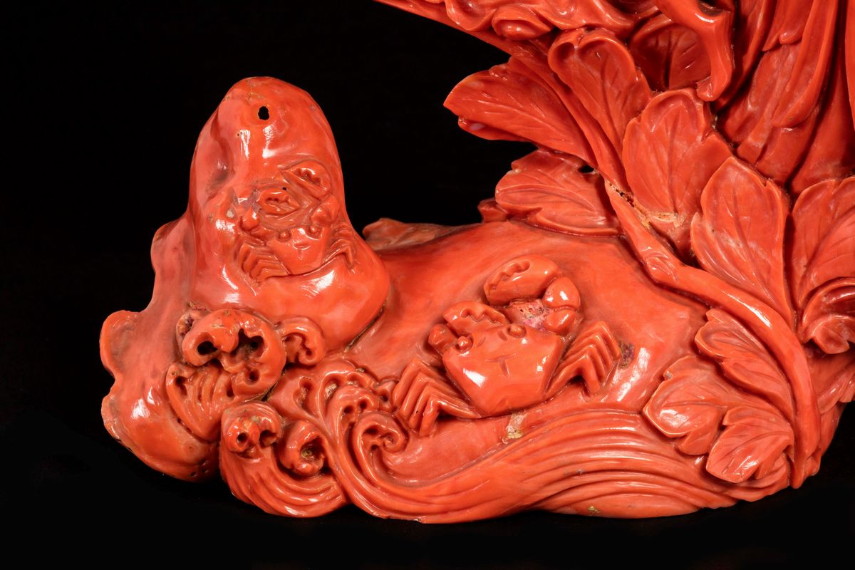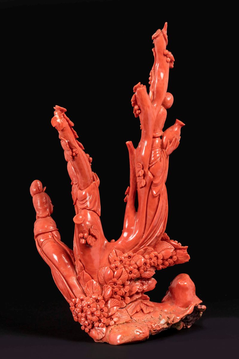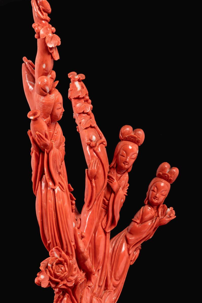 A carved coral three Guanyin with vases, flowers and a small dog group, China, early 20th century