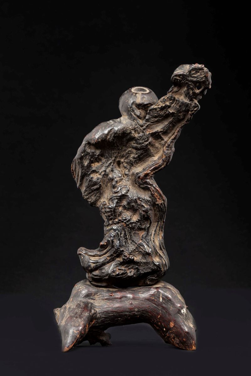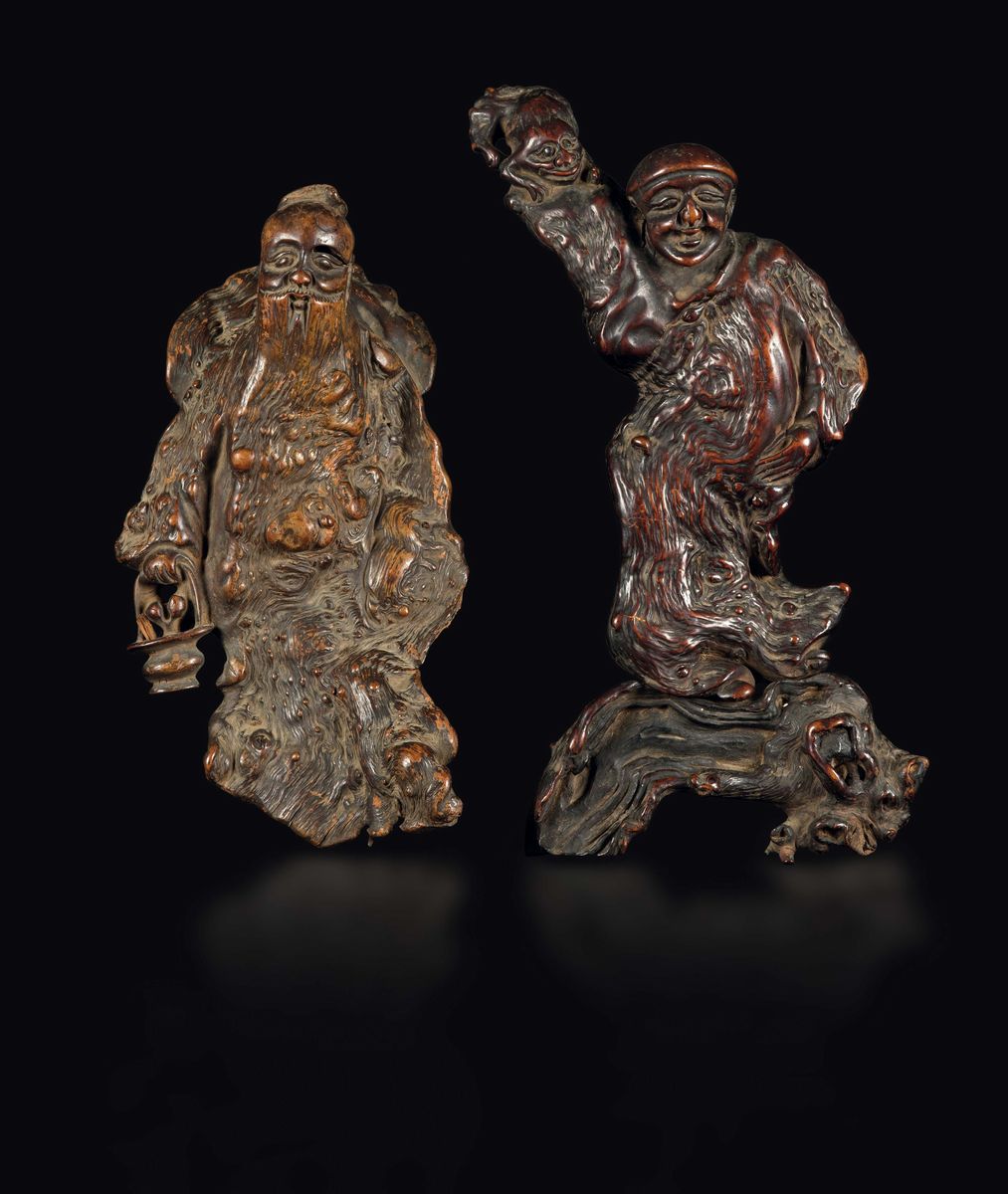 A carved huanghuali root figure of wise man with basket and a carved homu root figure of wise man with monkey, China, Qing [..]
