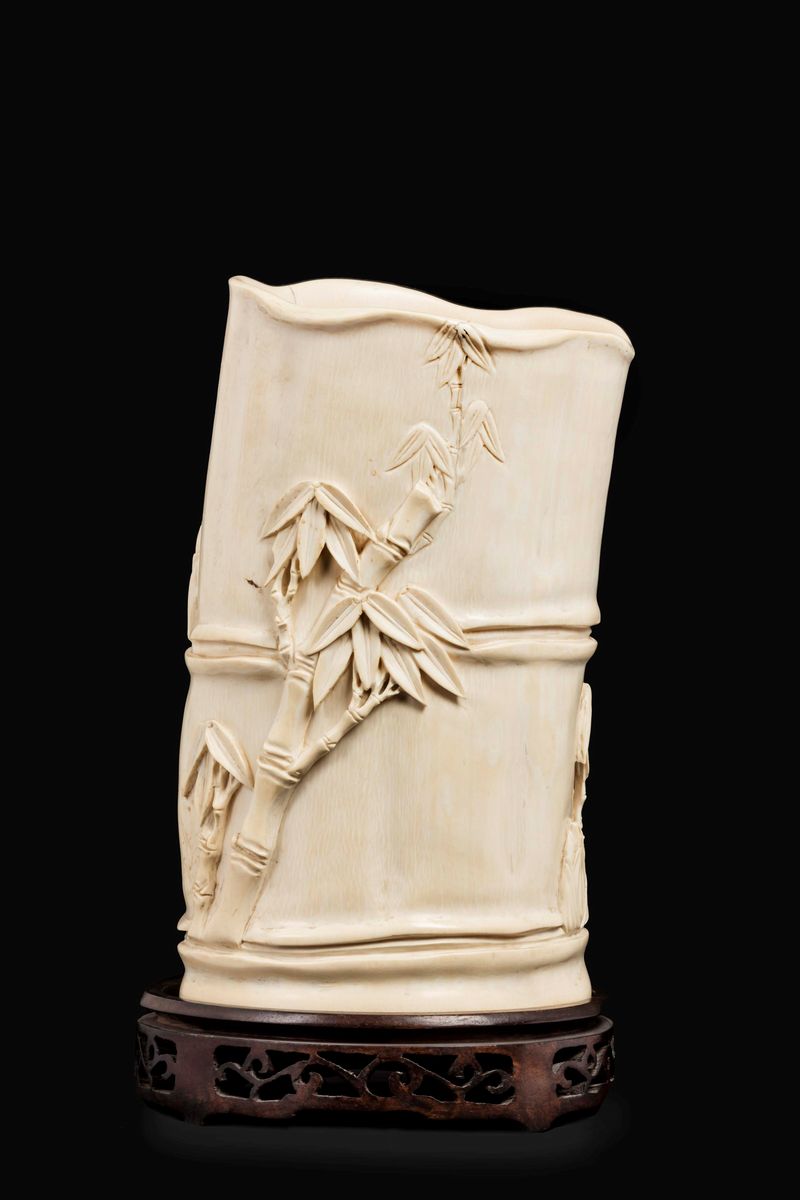 A carved ivory brushpot with bamboo in relief, China, Qing Dynasty, 19th century
