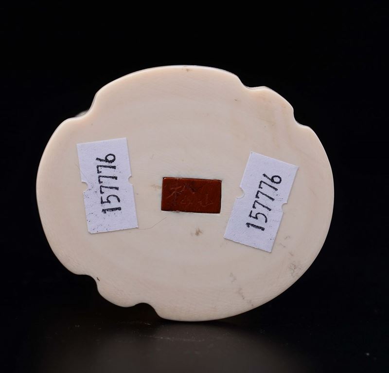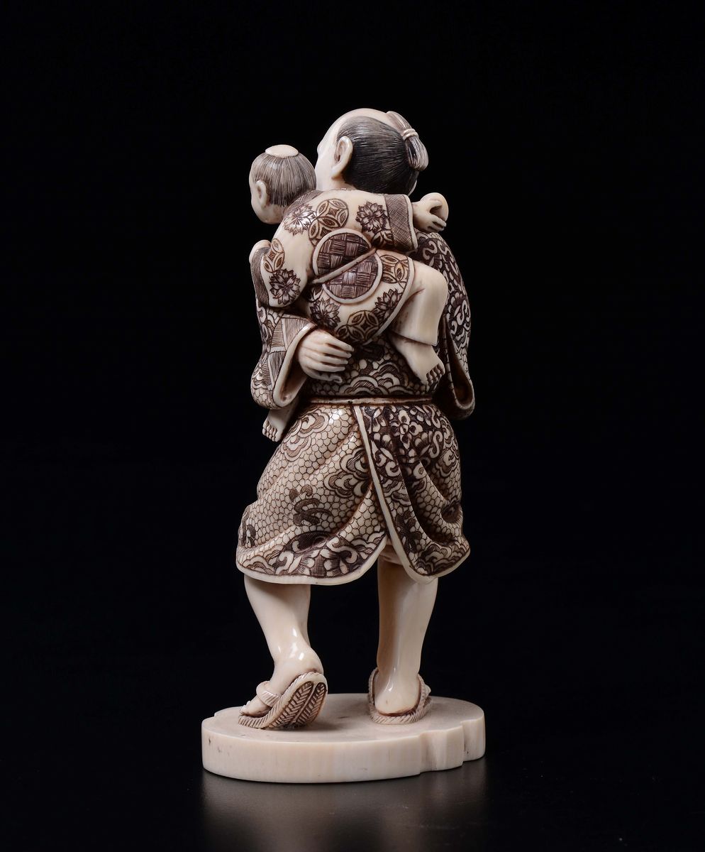 A carved ivory figure of peasant with child on the shoulders, Japan, early 20th century