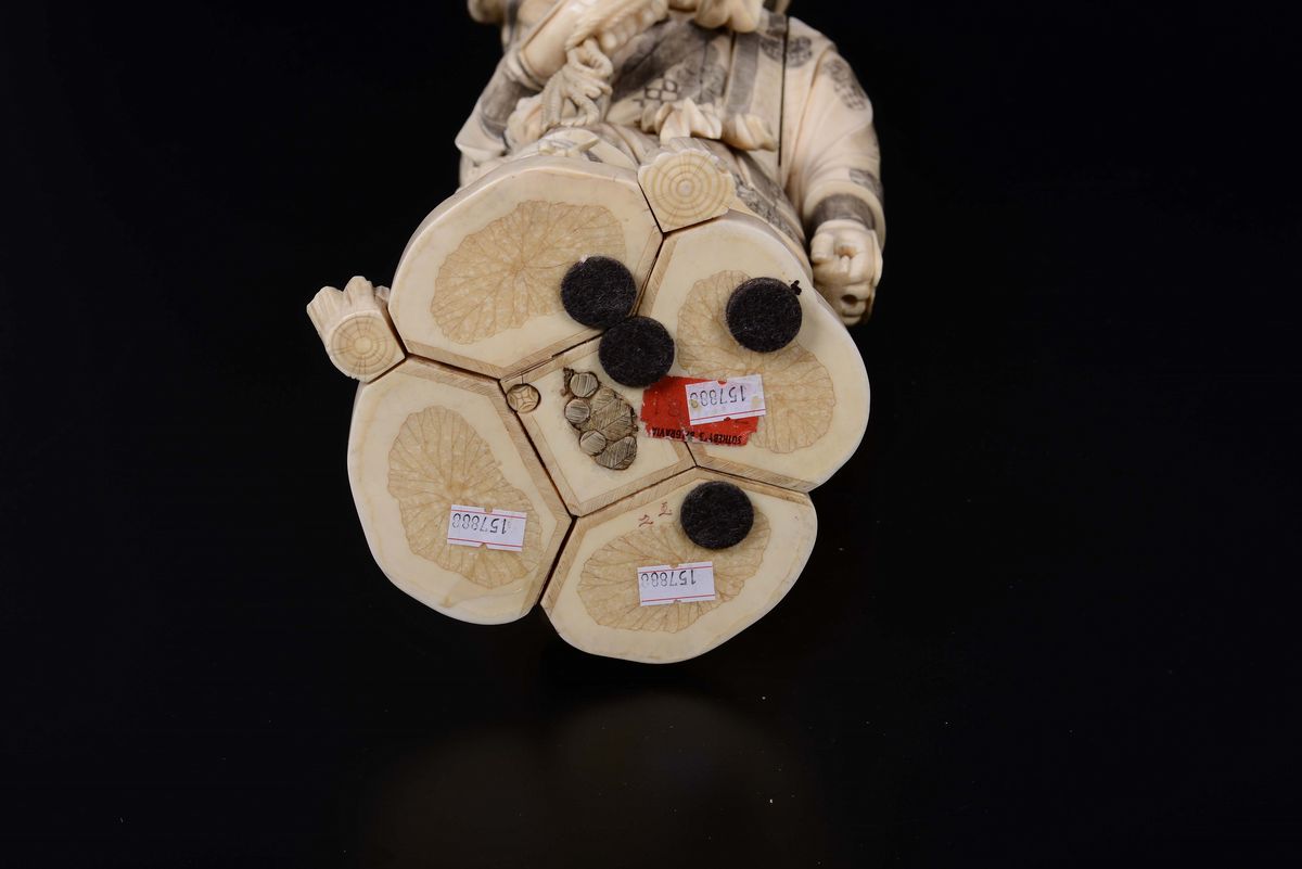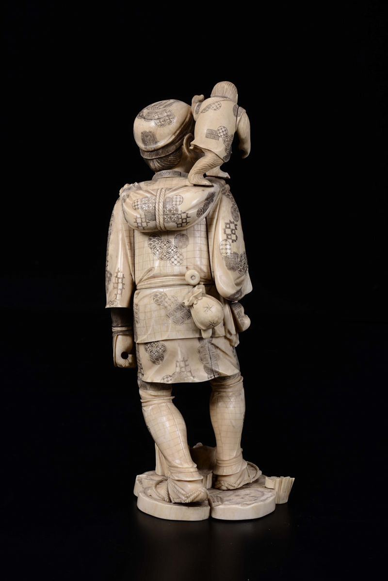 A carved ivory figure of peasant with monkey on his shoulder, Japan, early 20th century