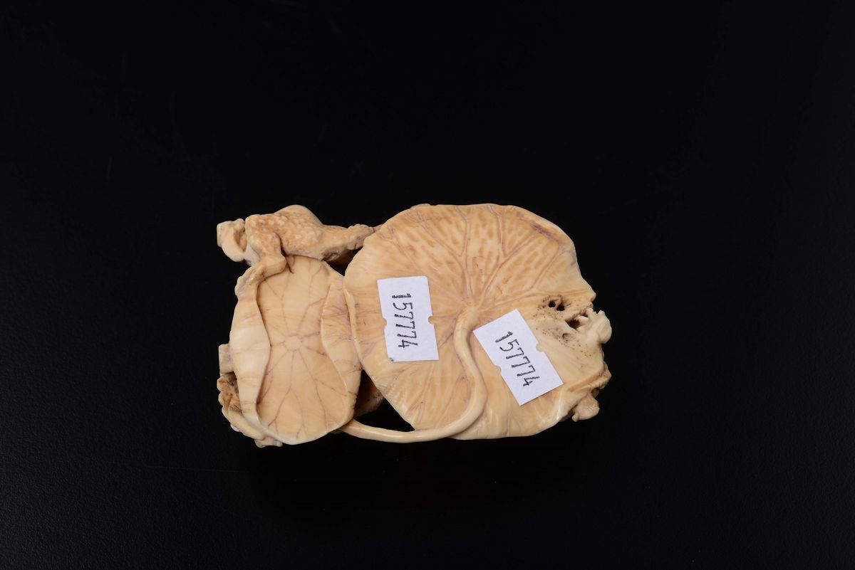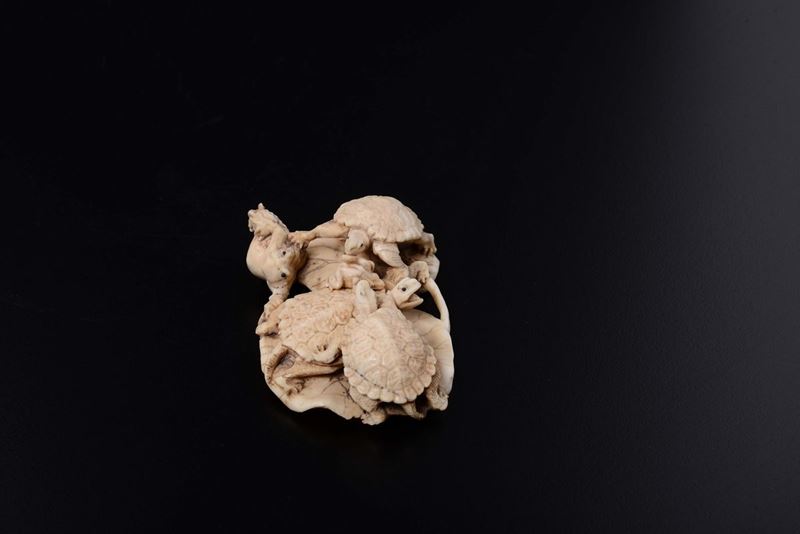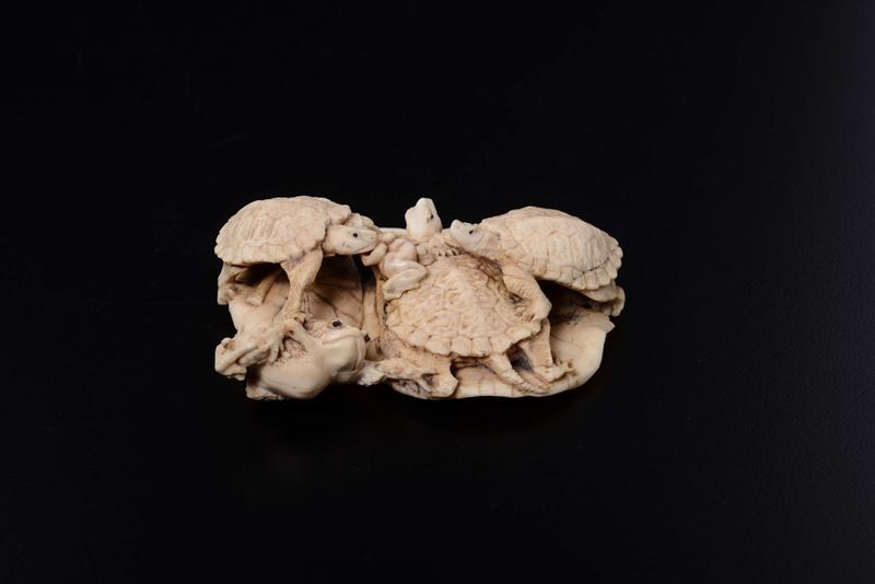 A carved ivory turtles and frogs on waterlilies group, Japan, early 20th century