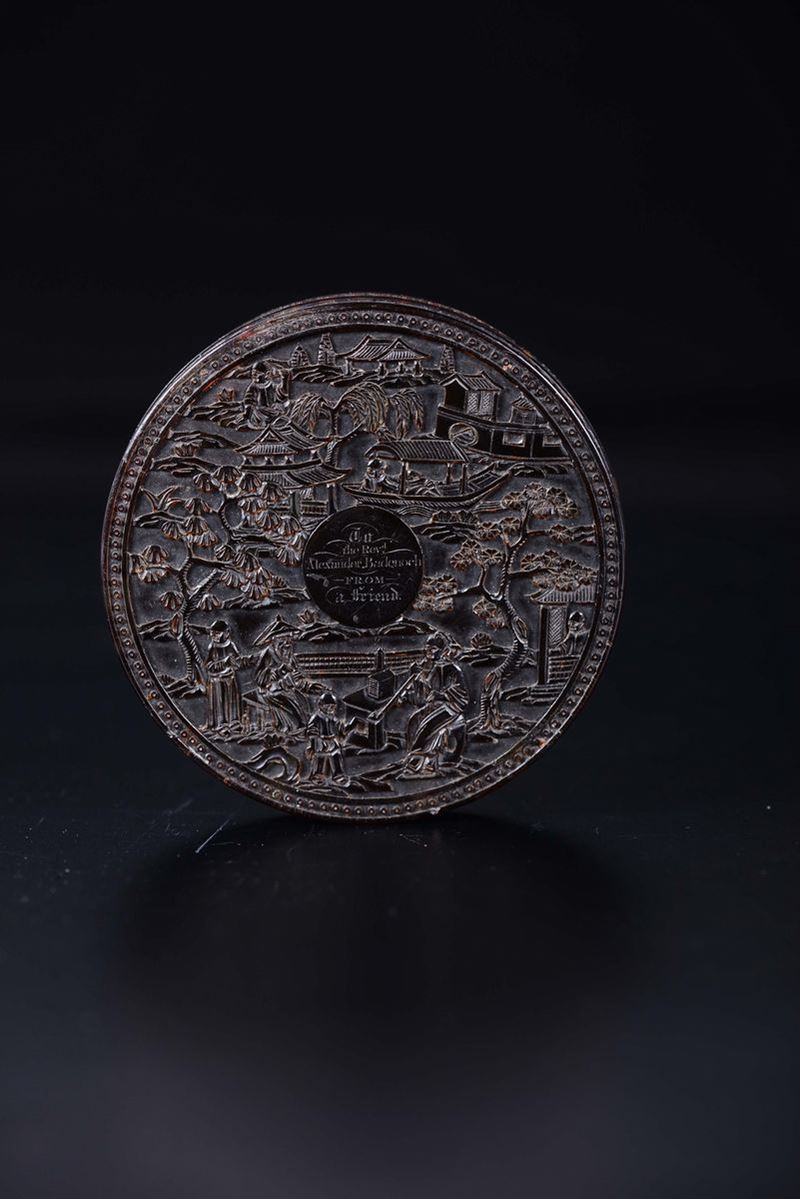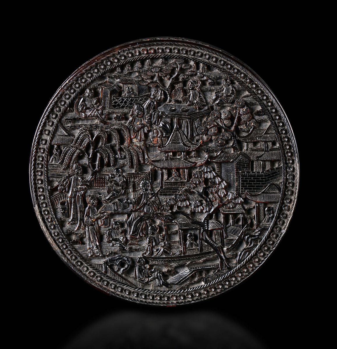 A carved tortoiseshell box and cover with common life scenes and inscription on the back, China, Canton, Qing Dynasty, 19th [..]