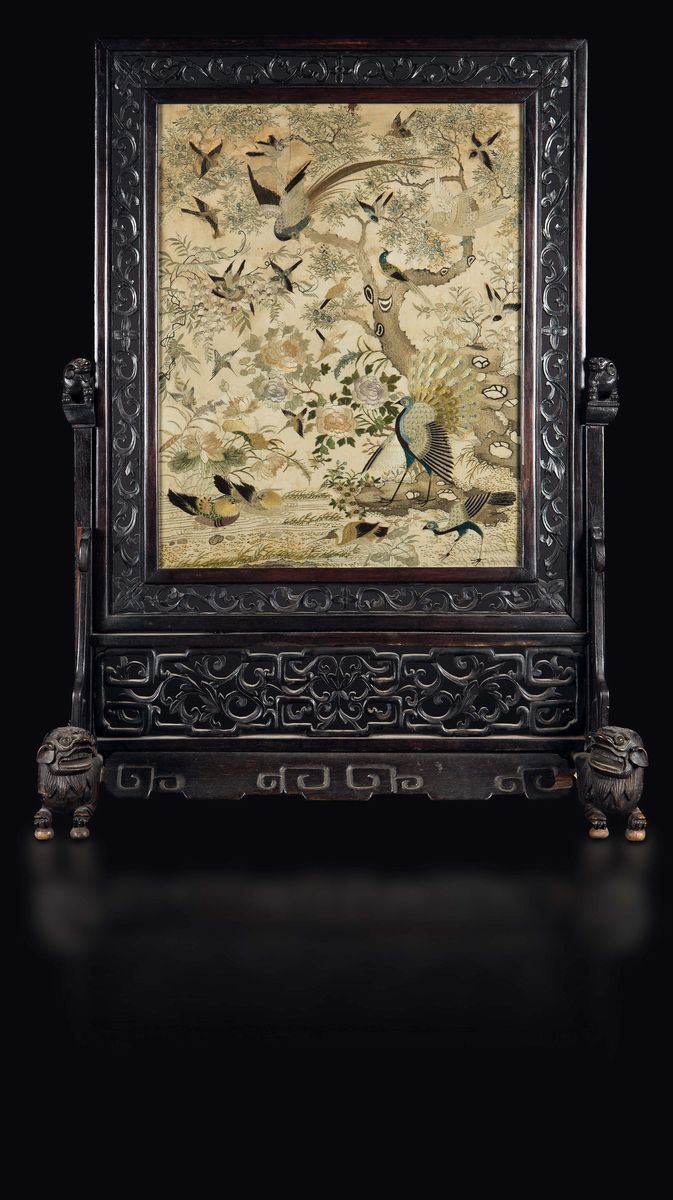 A carved wood firescreen with a silk cloth embroidered with birds, peacocks and roses, China, Qing Dynasty, 19th century
