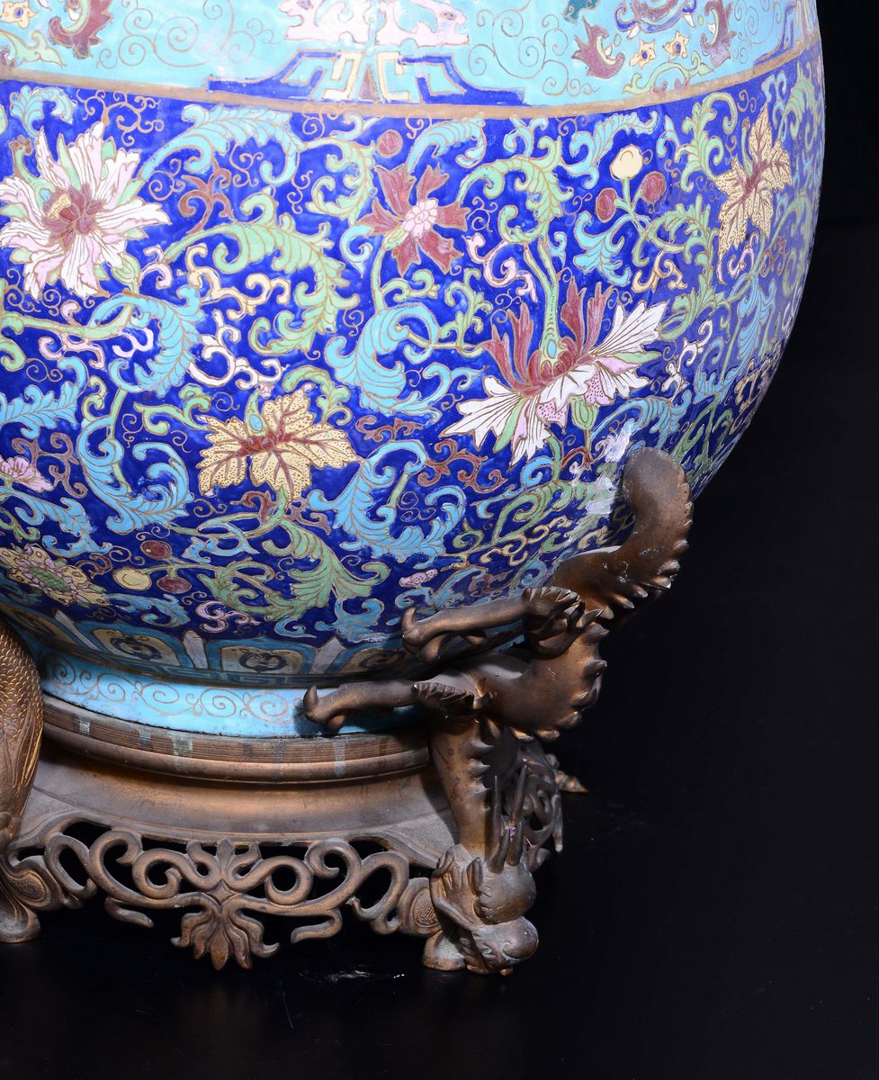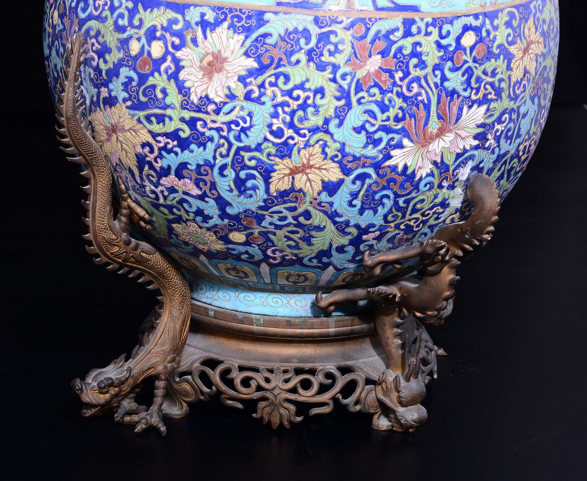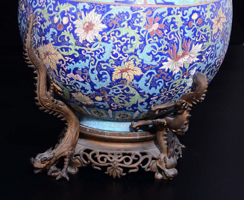 A cloisonné enamel cachepot with bronze dragons details, China, Qing Dynasty, 19th century