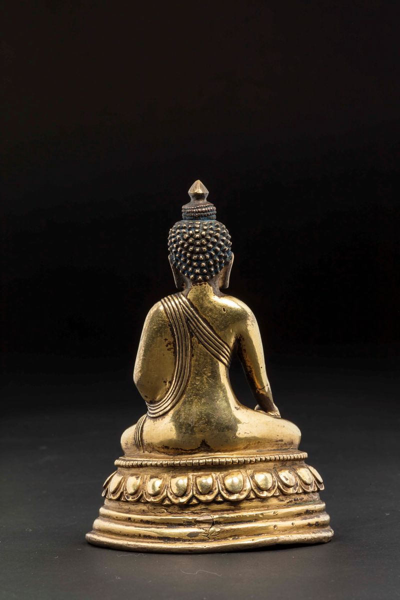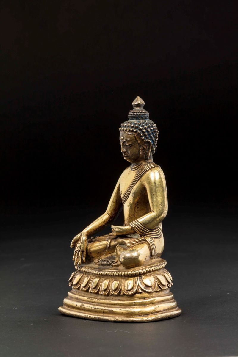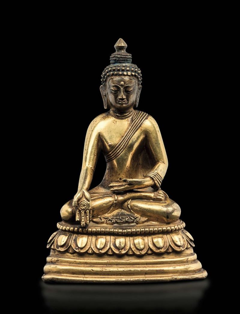 A gilt bronze figure of Buddha Sakyamuni seated on a double lotus flower, China, Qing Dynasty, 18th century