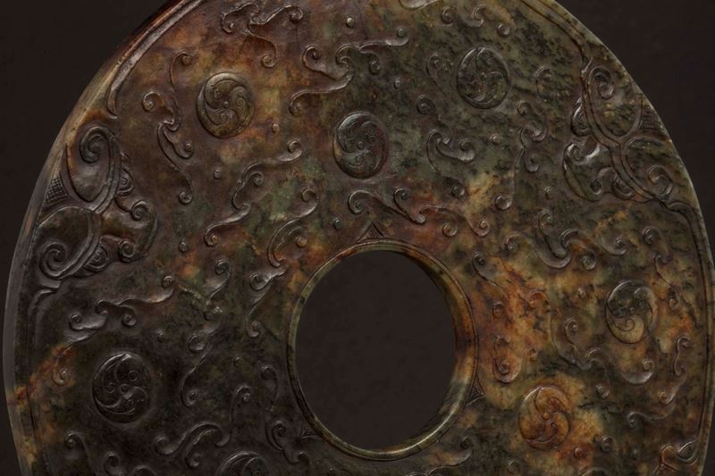 A green and russet jade Bi with an archaic style motif, China, Ming Dynasty, 17th century