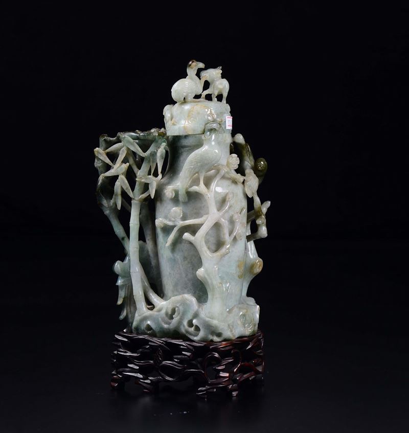 A green and russet jade vase and cover with branches and birds in relief, China, Qing Dynasty, 19th century
