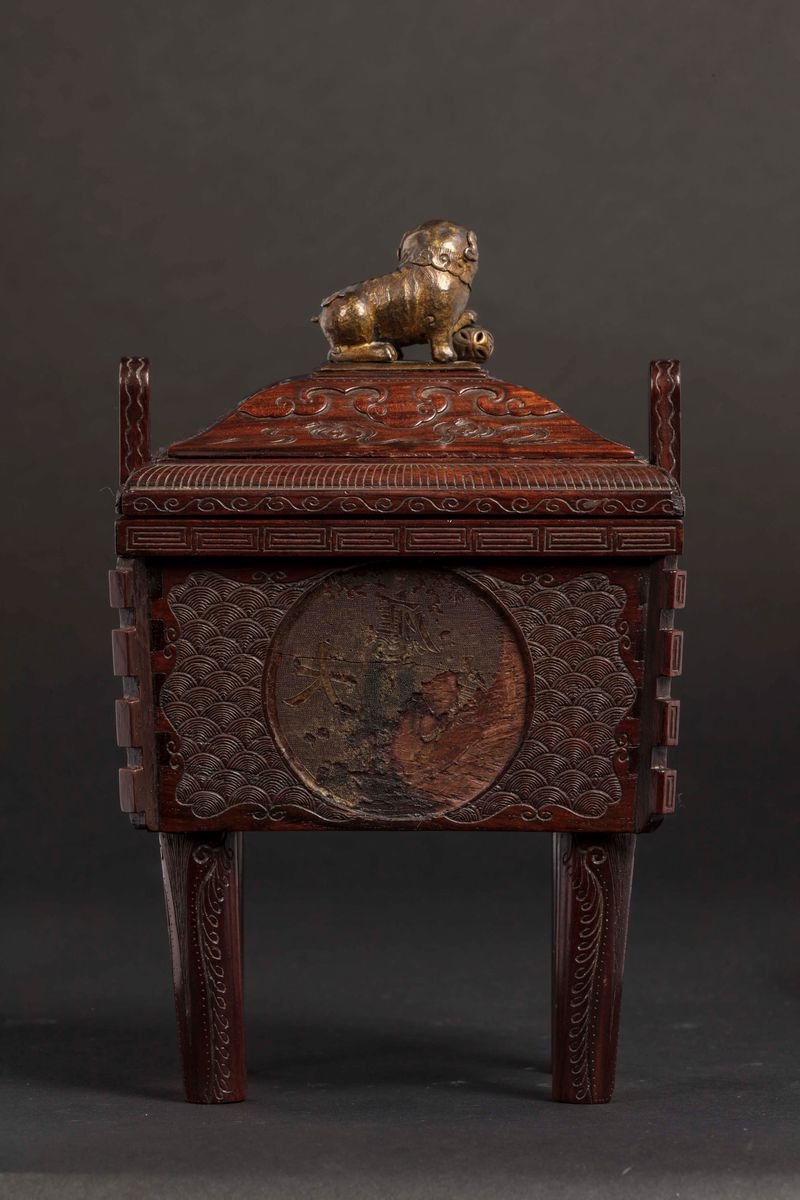 A huanghuali censer and cover with bronze Pho dog and inscription Yongzheng within one reserves, China, Qing Dynasty, 18th [..]