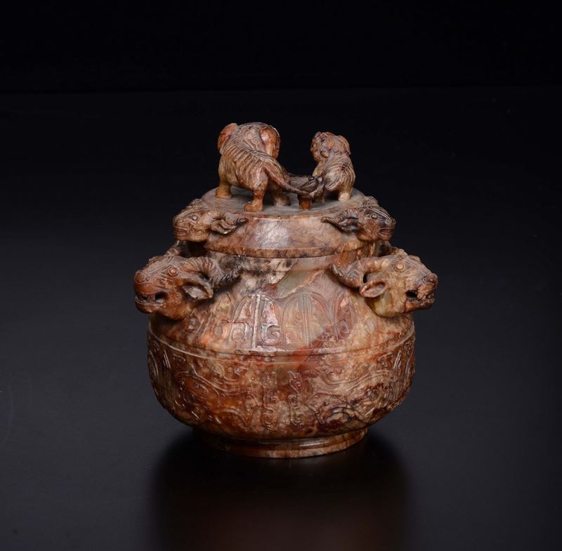 A jade censer with animals in relief and an archaic style motif, China, Qing Dynasty, 18th century