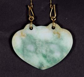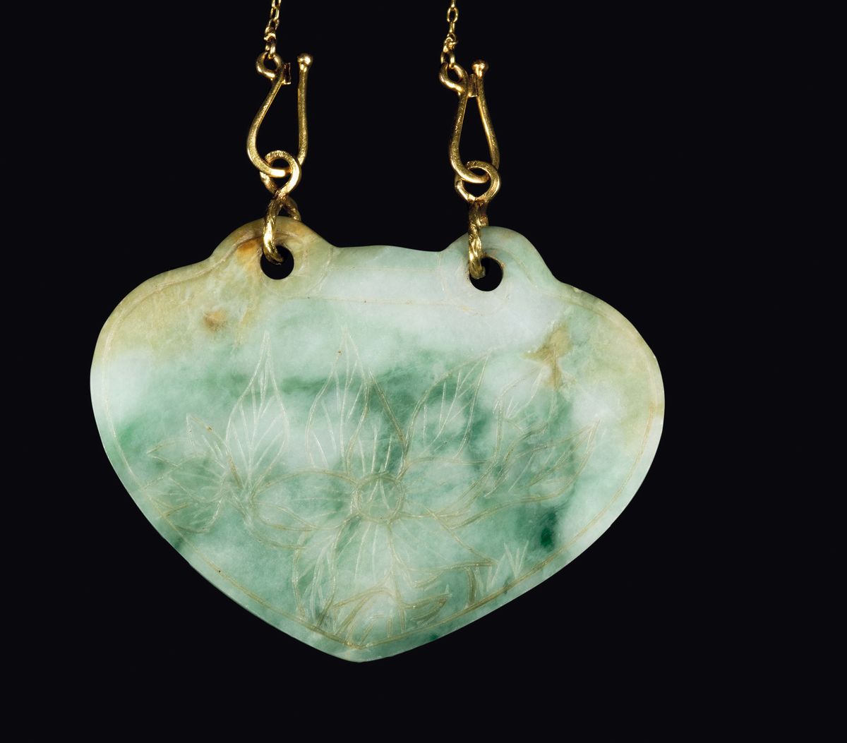 A jadeite and russet pendant with flowers and inscription with gold chain, China, 20th century