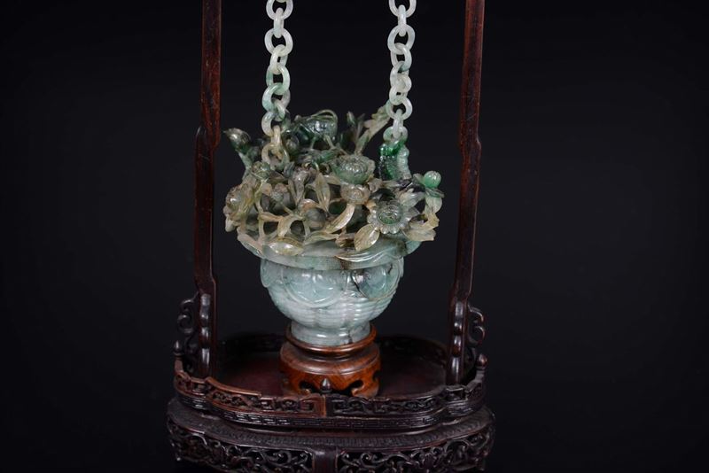 A jadeite basket and chain with leaves and cicadas in relief, China, early 20th century