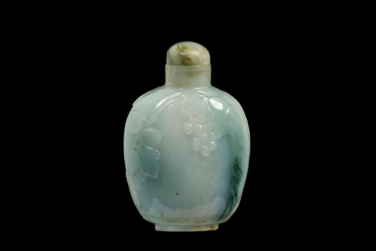 A jadeite snuff bottle with grapes in relief, China, Qing Dynasty, 19th century