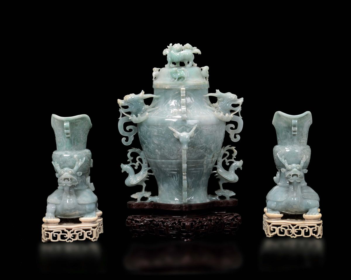 A jadeite triptyque: a vase with dragons and two mythical beast with vase on their back with ivory stands, China, early [..]