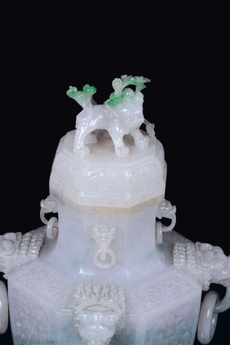A large apple green shades jadeite vase and cover with Pho dog-heads ring handles, China, early 20th century