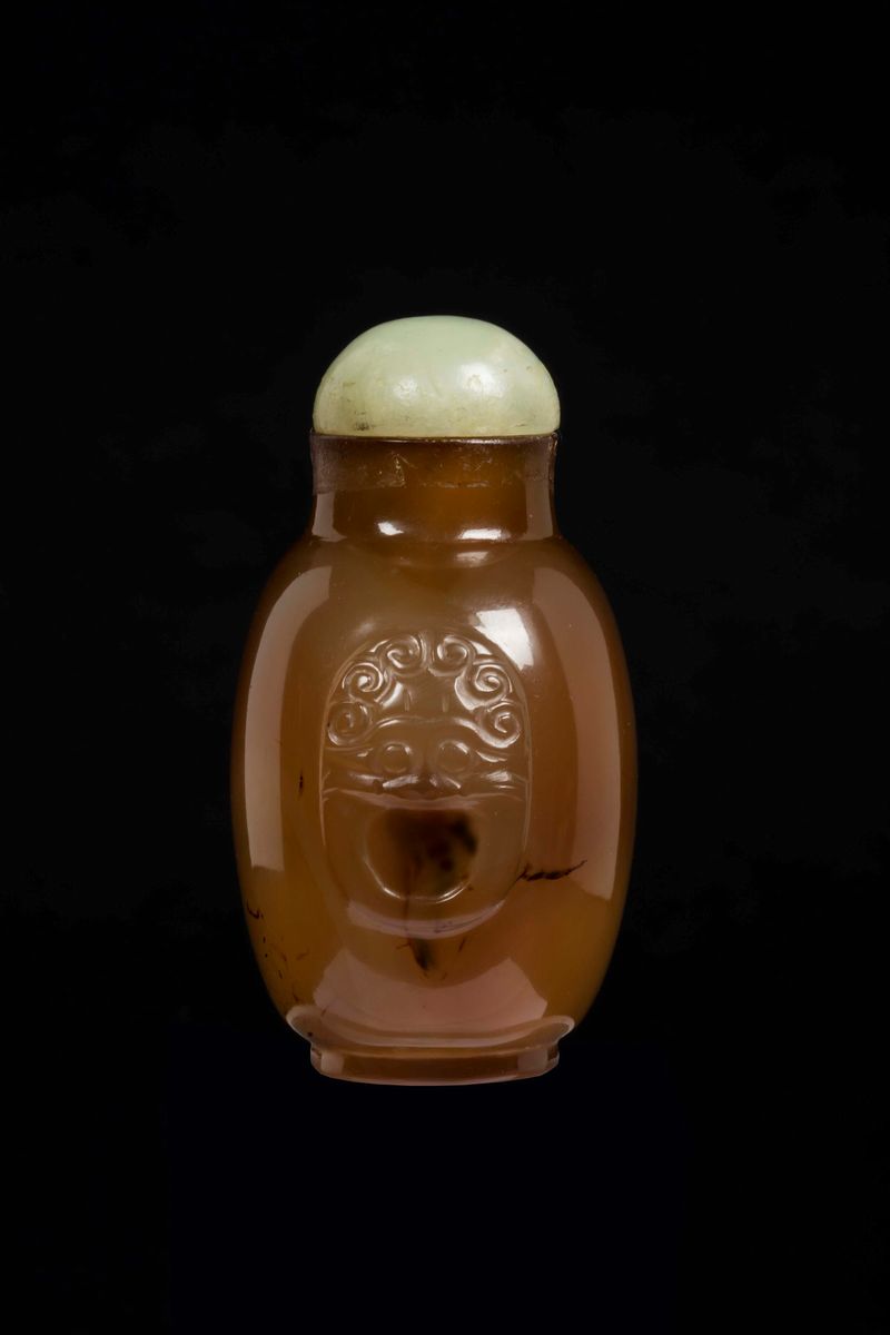 A moss agate snuff bottle with mask handles and jade stopper, China, Qing Dynasty, 19th century