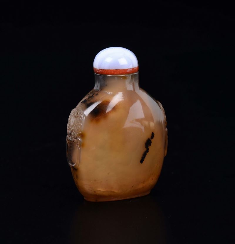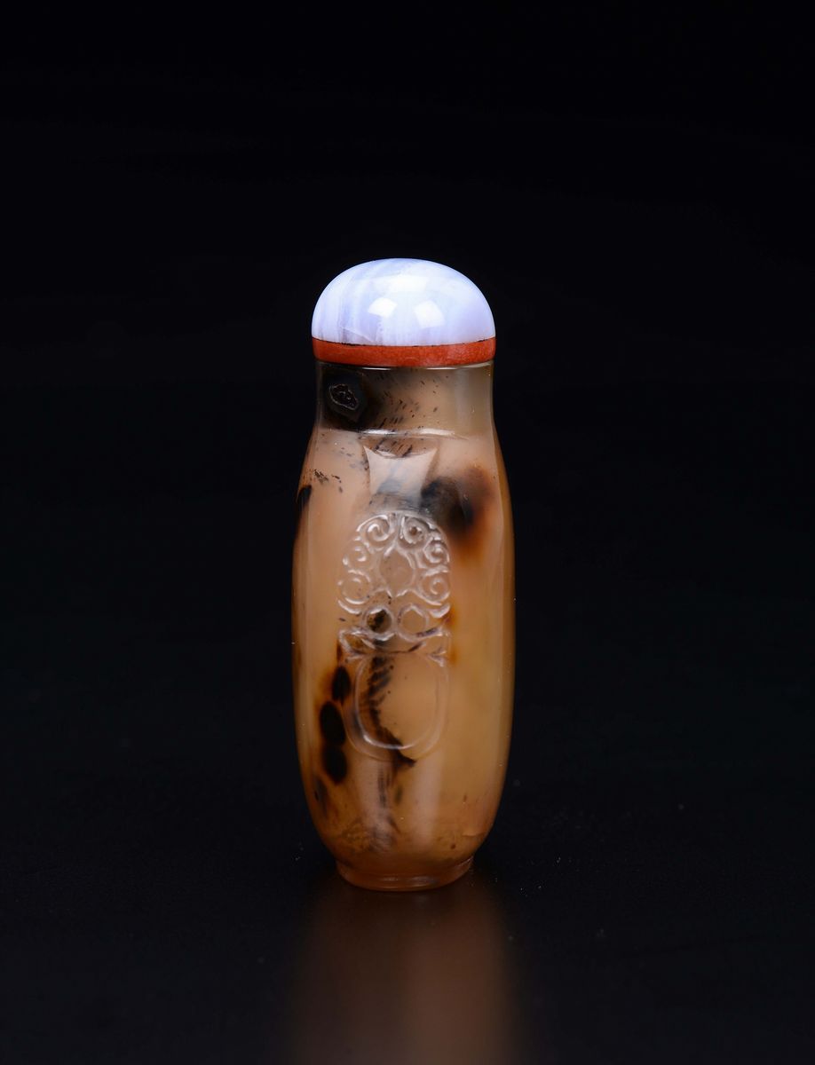 A moss agate snuff bottle with mask handles, China, Qing Dynasty, 19th century