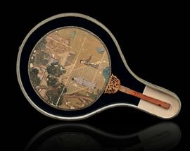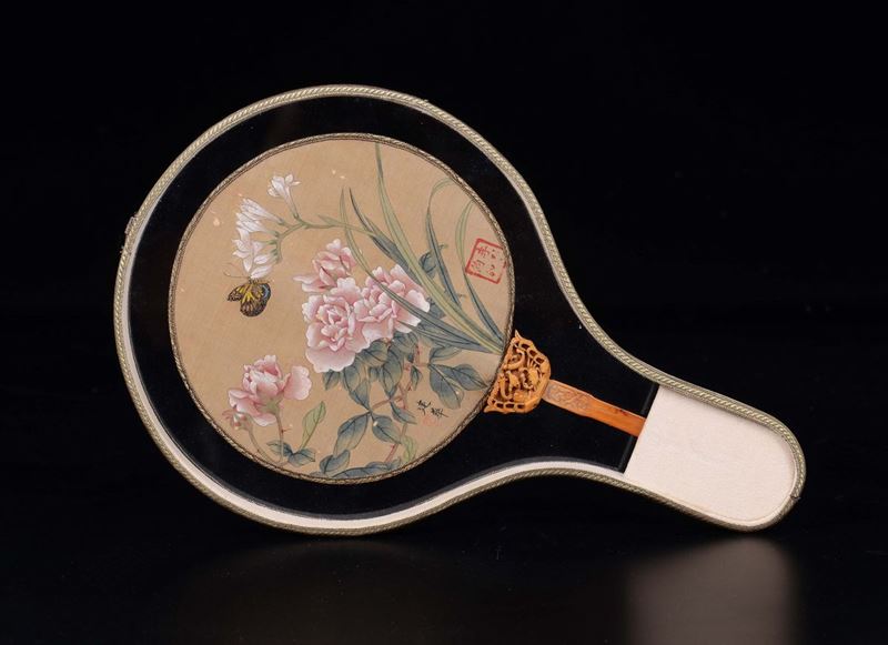 A painted fan with figures and not coeval flowers, with a carved toucan beak handle, China, Qing Dynasty, 18th/19th centu [..]