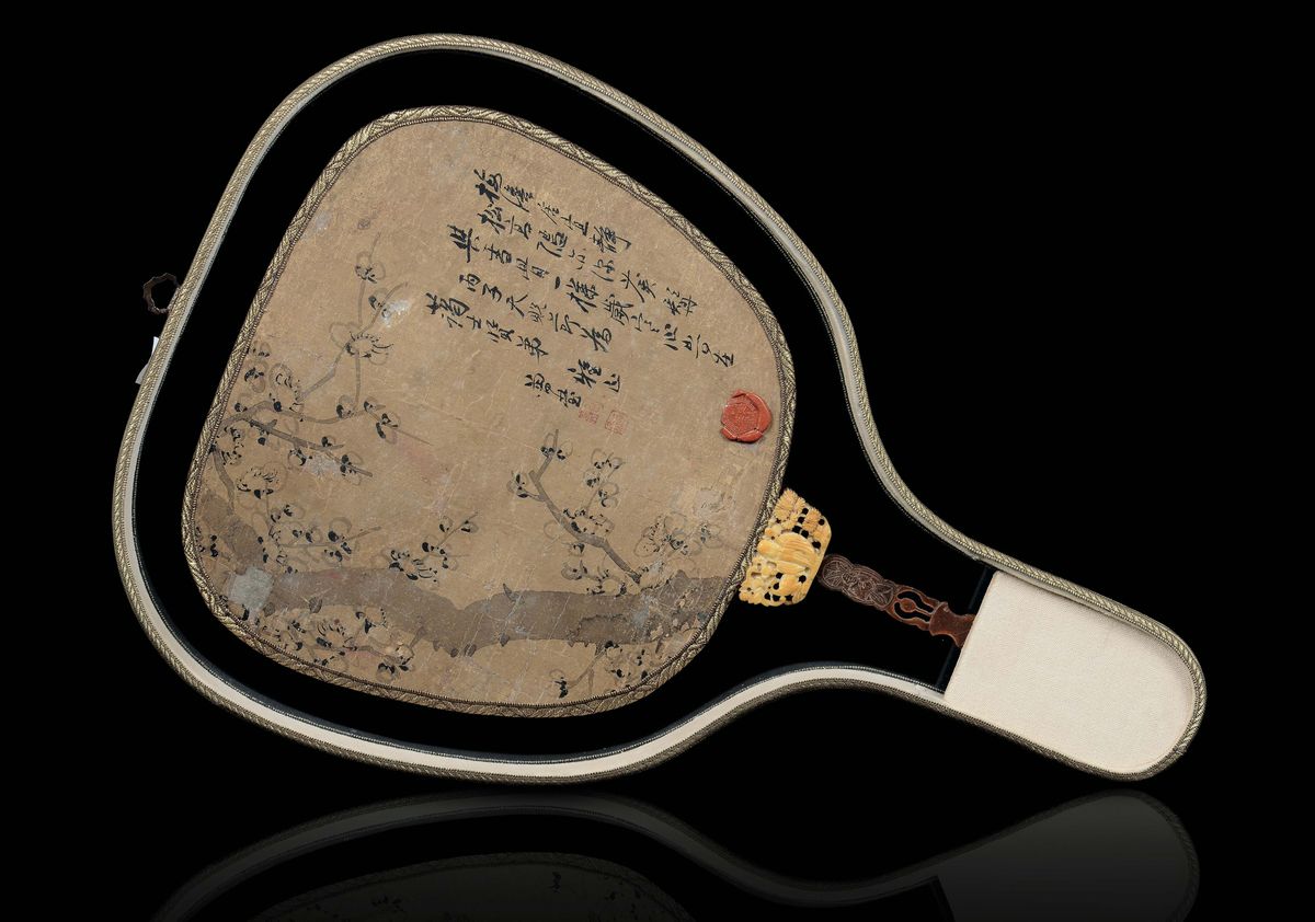 A painted fan with flowering branches and a not coeval landscape, with carved ivory and horn handle, China, Qing Dynasty, [..]
