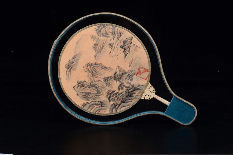 A painted fan with flowers and a not coeval landscape, with carved ivory and bone handle, China, Qing Dynasty, 18th/19th [..]