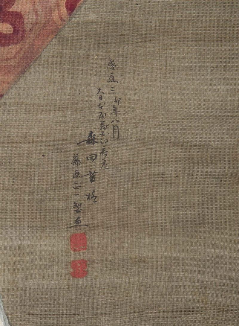 A painting on silk depicting figure of Geisha with flute and inscription, Japan, early 20th century