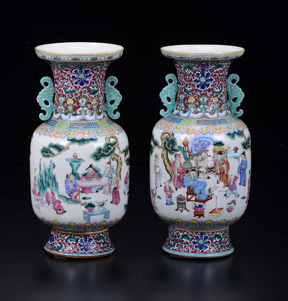 A pair of polychrome enamelled porcelain vases with wise men and children, China, Qing Dynasty, Guangxu Period (1875-1908 [..]