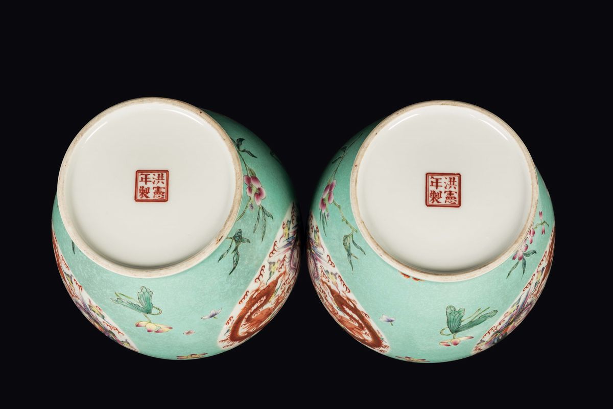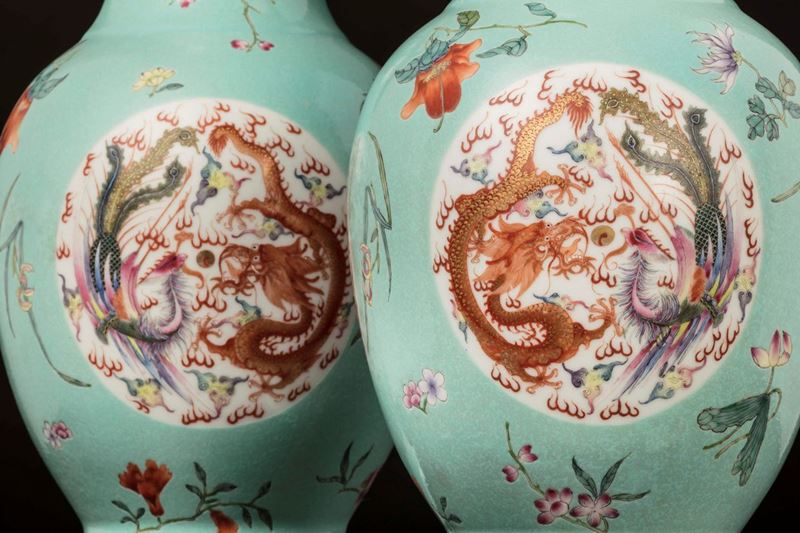 A pair of turquoise-ground porcelain dragon and phoenix vases, China, Republic, 20th century