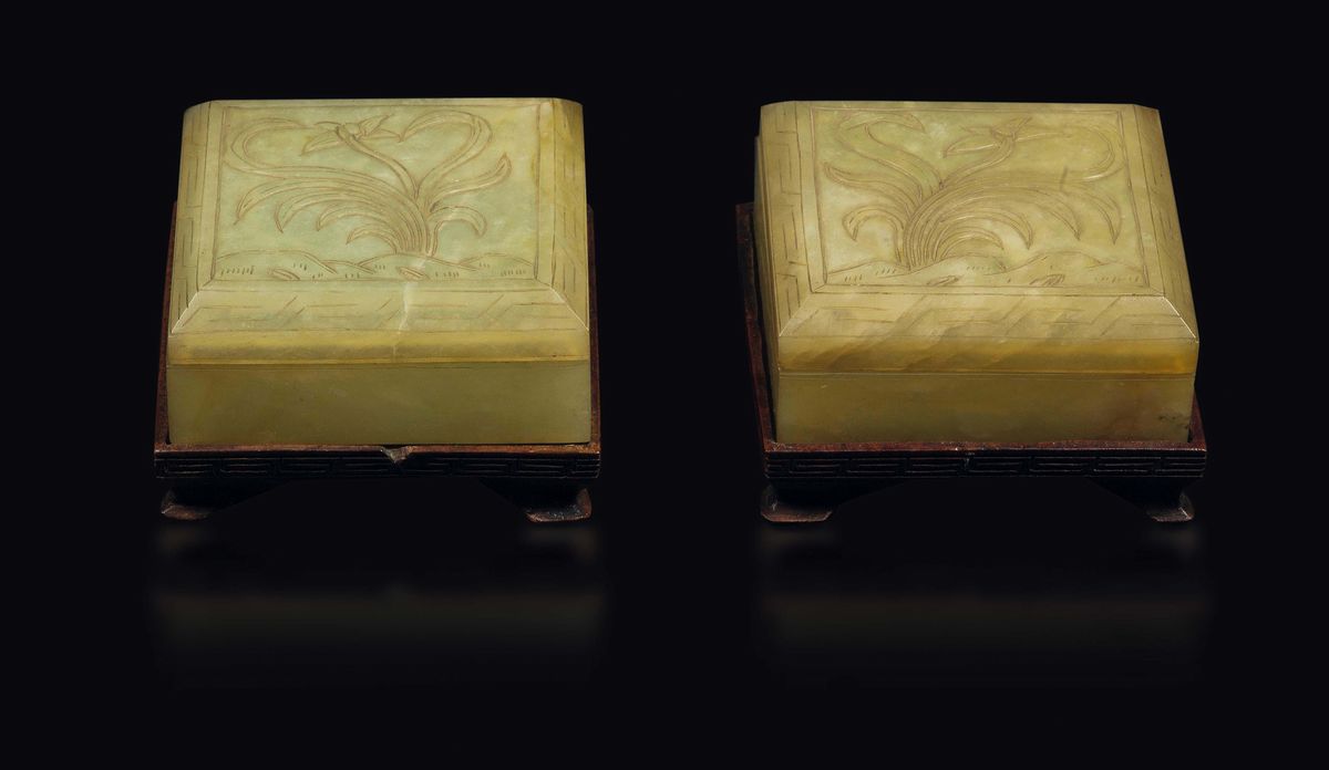 A pair of yellow jade boxes and cover with flowers, China, Qing Dynasty, 19th century