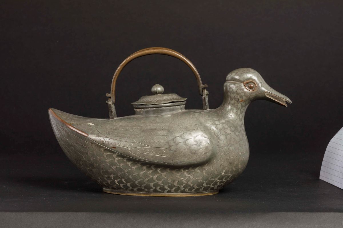 A pewter duck teapot, China, Qing Dynasty, 19th century