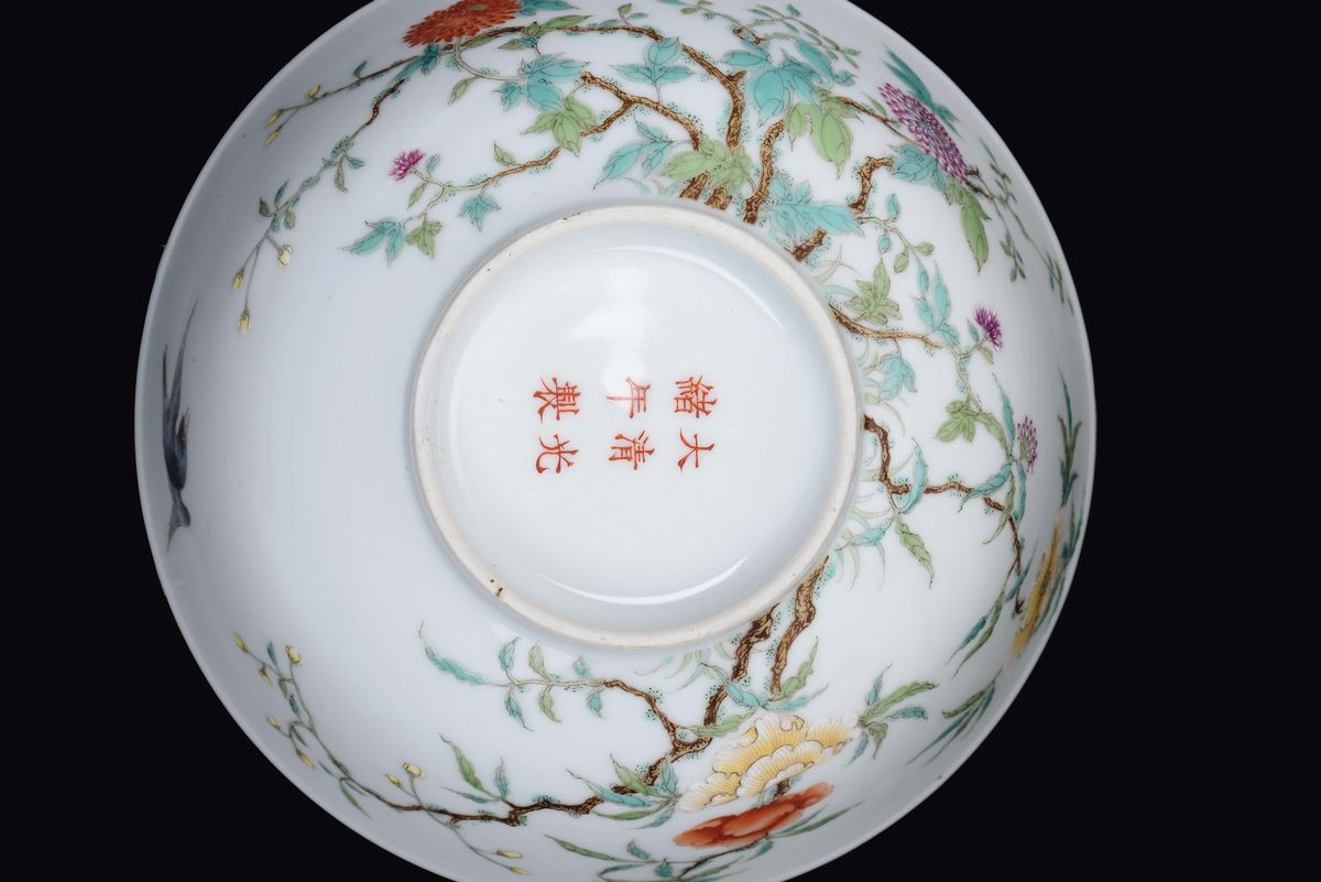 A polychrome enamelled porcelain cup with flowers and birds, China, Qing Dynasty, 19th century