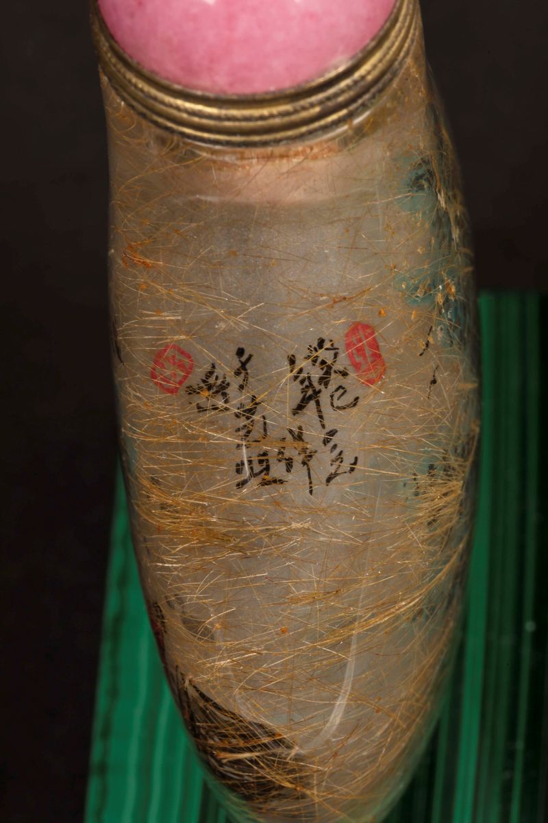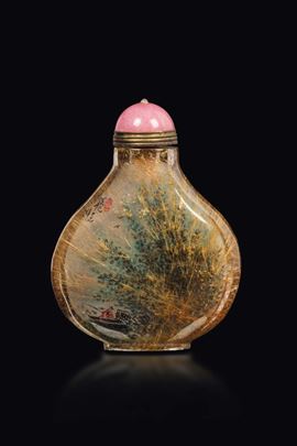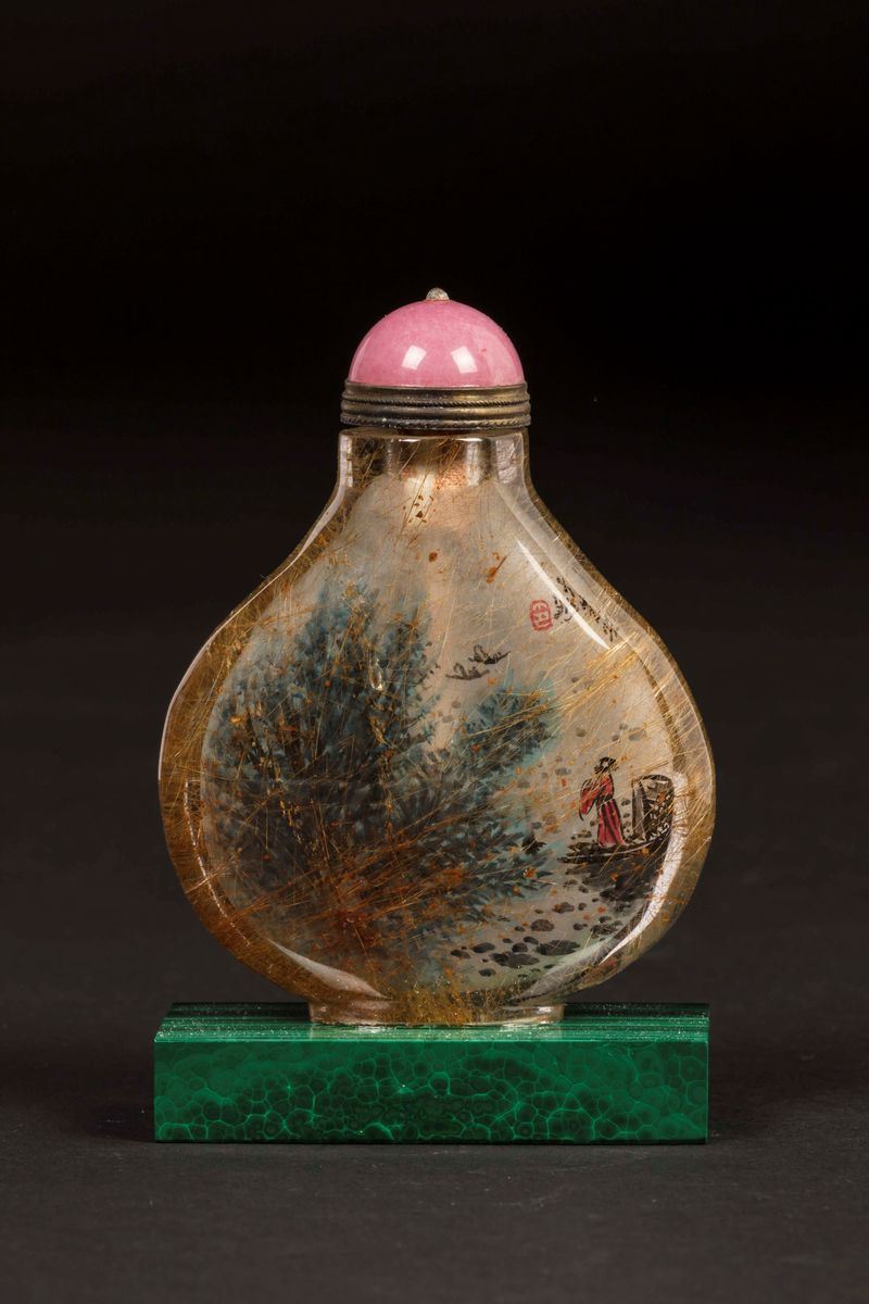 A quartz snuff bottle depicting landscapes and inscriptions with malachite stand, China, early 20th century