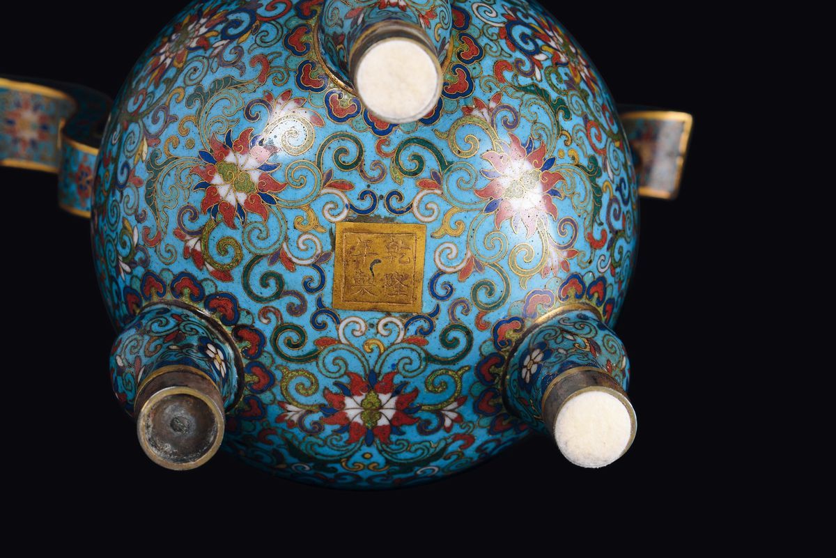 A rare cloisonné enamel tripod censer and a cover, China, Qing Dynasty, Qianlong Mark and of the Period (1736-1795)