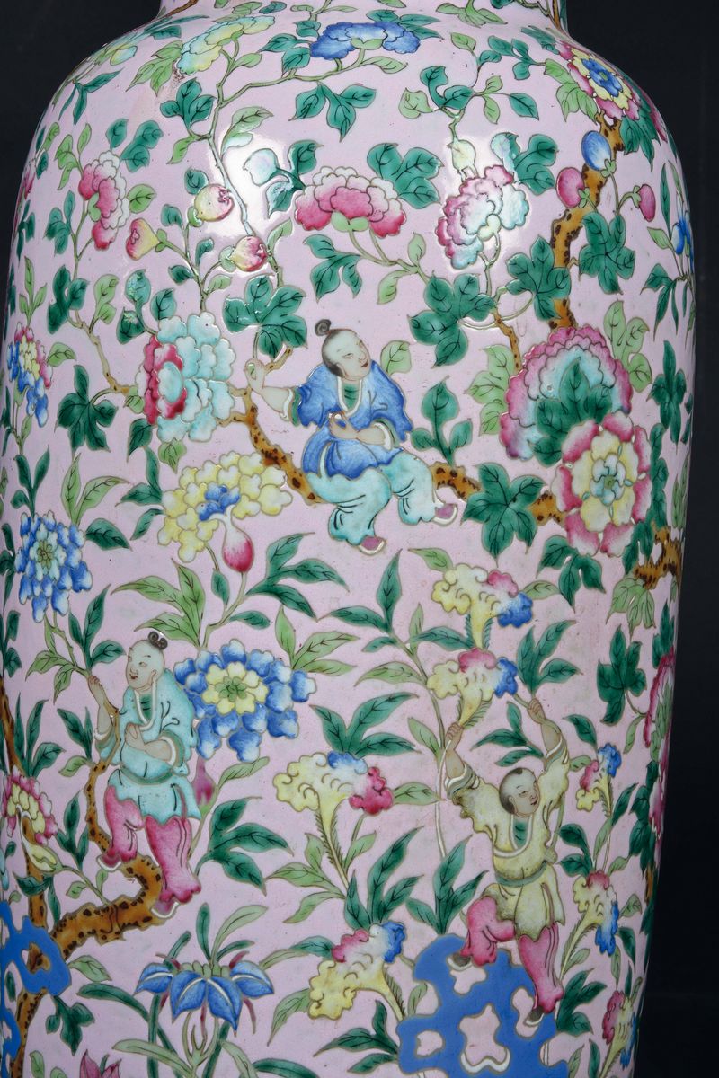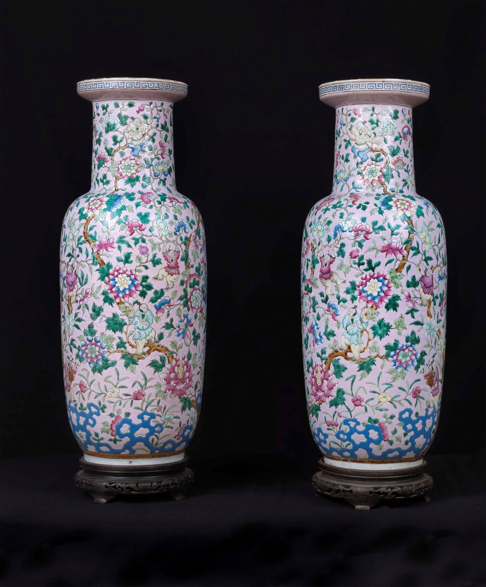 A rare pair of Famille-Rose vases with playing children between flowering branches, China, Qing Dynasty, Daoguang Period [..]