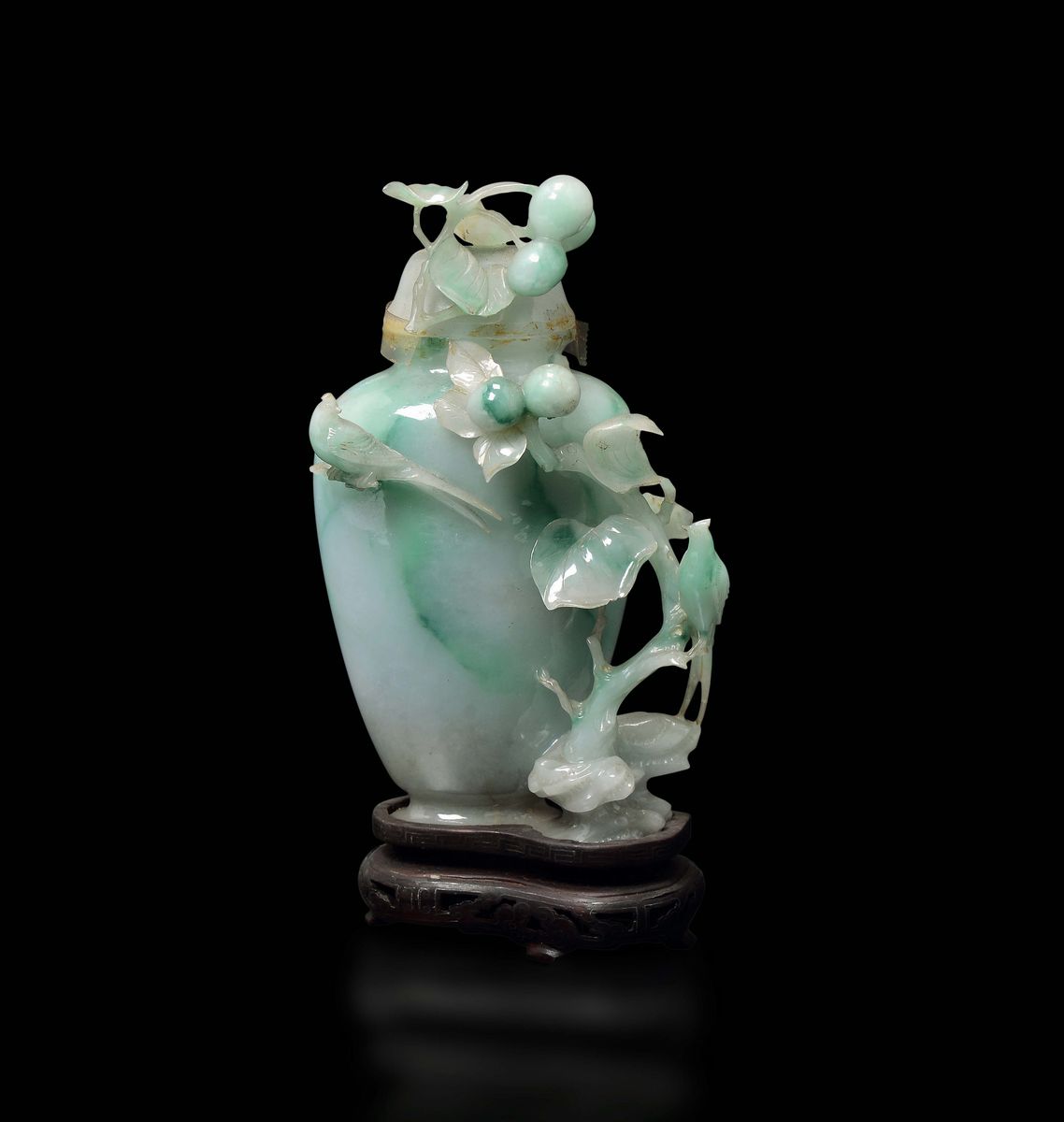 A small apple green shades jadeite vase and cover with peaches and birds in relief, China, early 20th century
