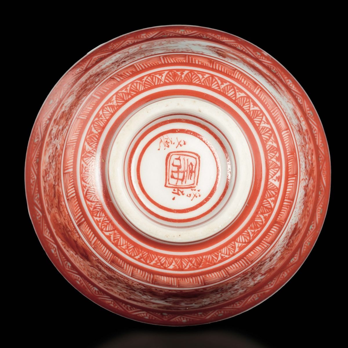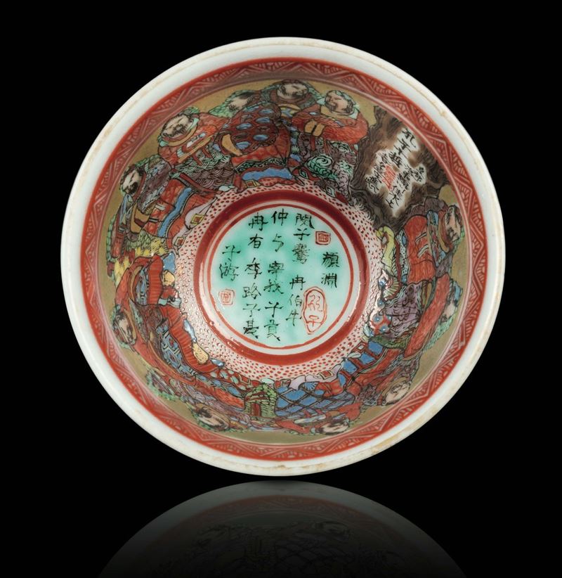 A small polychrome enamelled porcelain cup with inside decoration of wise men and inscriptions, China, Qing Dynasty, 19th [..]