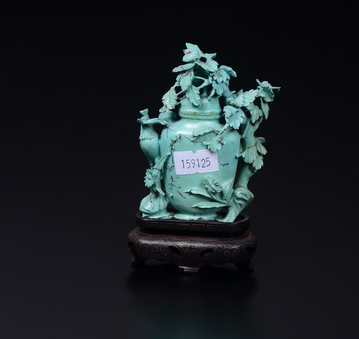 A small turquoise vase and cover with branches and peacock in relief, China, early 20th century