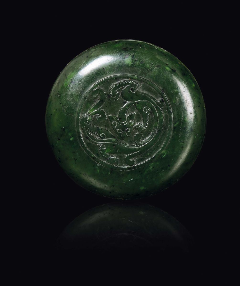 A spinach green jade box and cover, China, Qing Dynasty, Qianlong Period (1736-1795)
