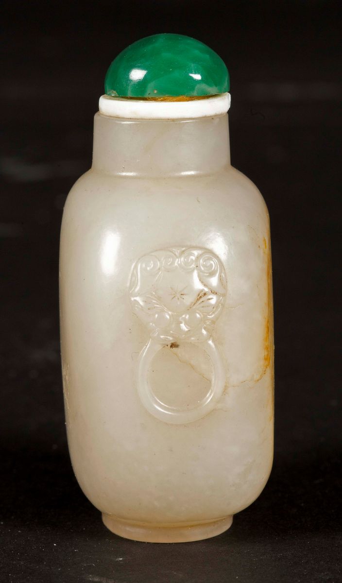 A white and russet jade snuff bottle with mask handles, China, Qing Dynasty, 19th century