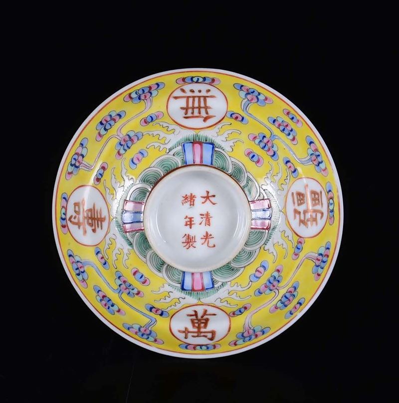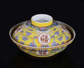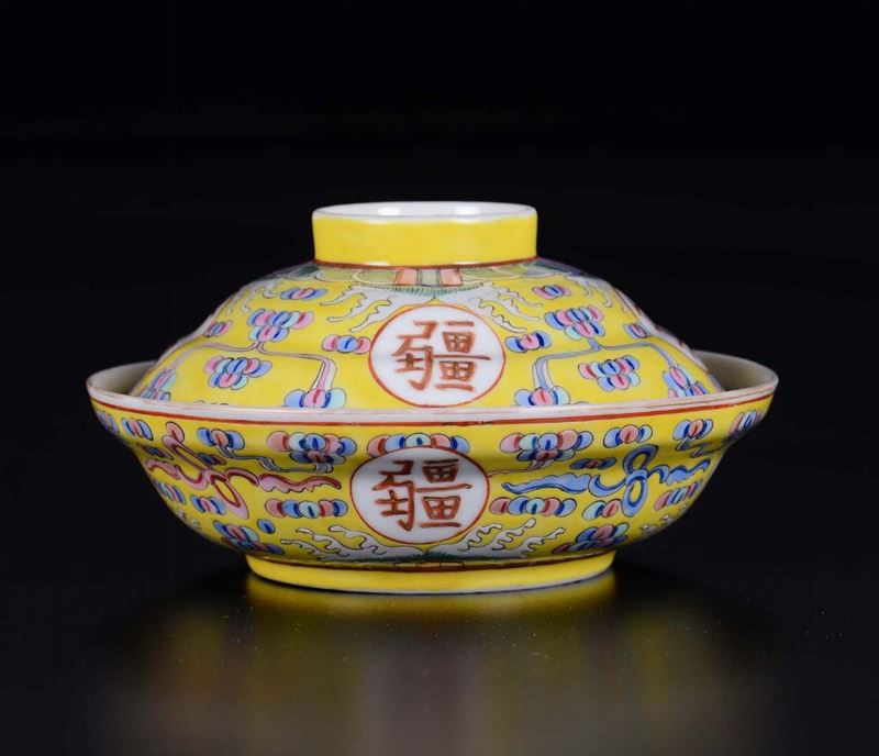 A yellow-ground porcelain cup and cover with inscriptions, China, early 20th century
