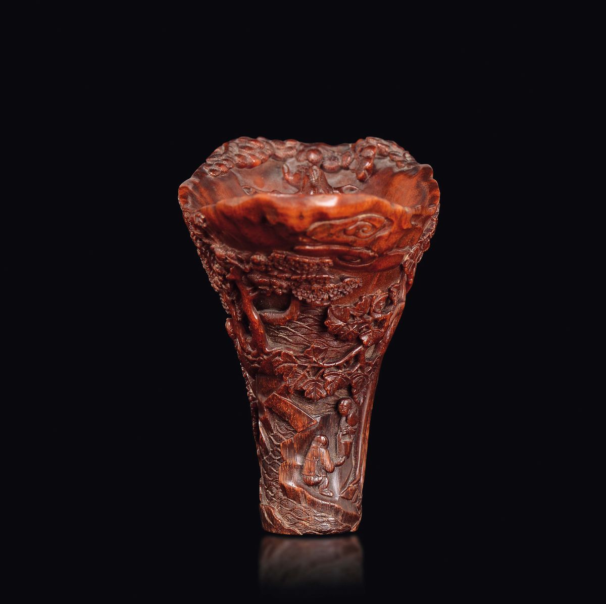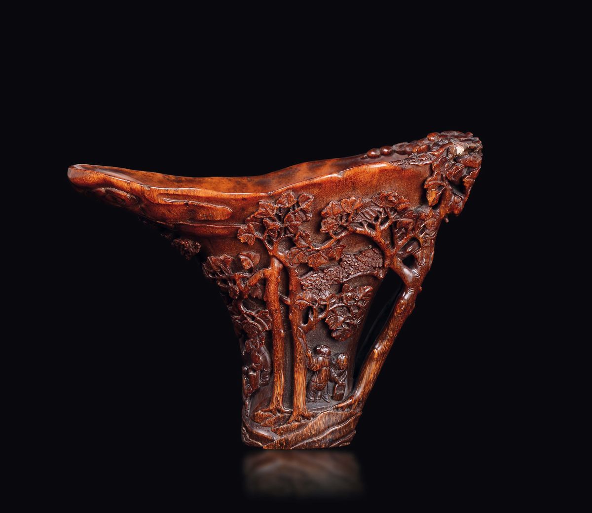 An extraordinary finely carved rhino horn libation cup with wise men within landscape, China, Qing Dynasty, second half of 17th century