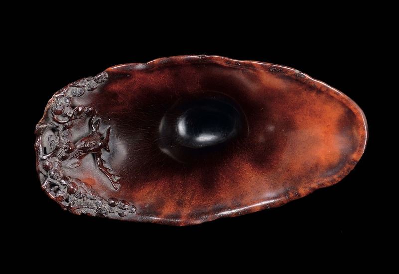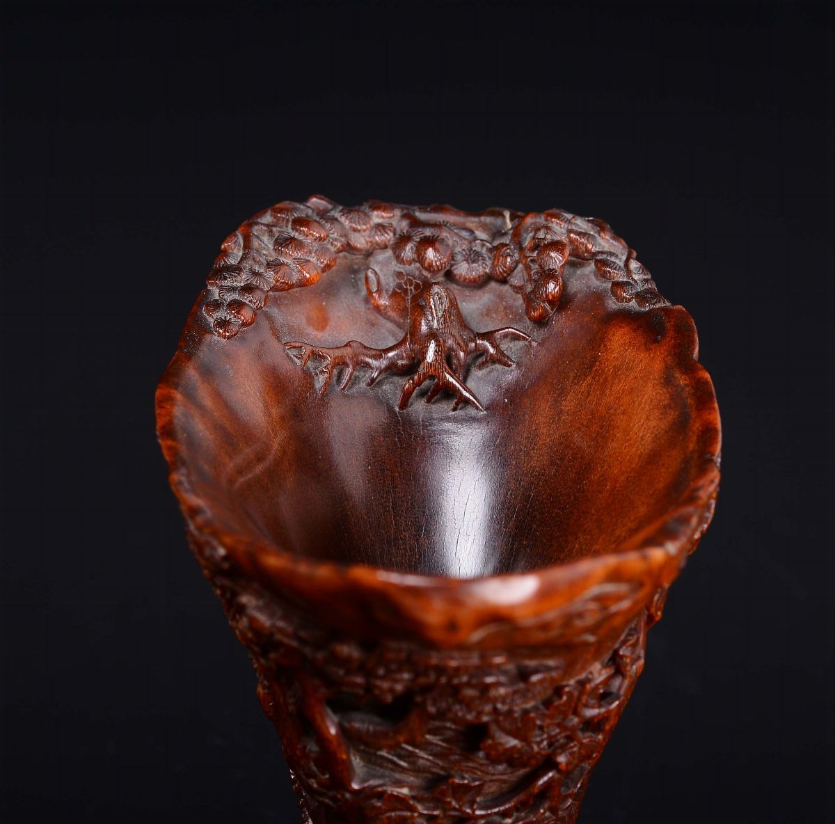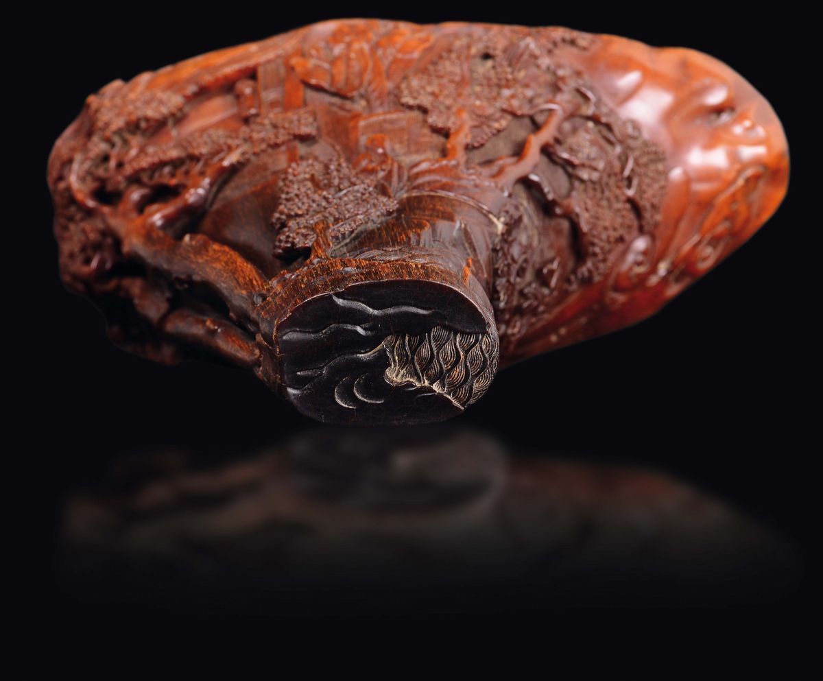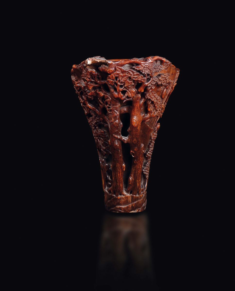 An extraordinary finely carved rhino horn libation cup with wise men within landscape, China, Qing Dynasty, second half [..]