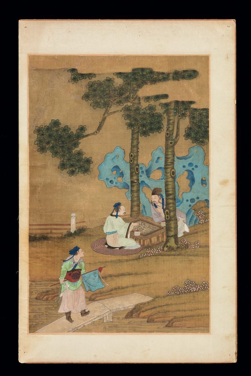 Five paintings on silk with common life scenes, wise men and dignitaries within landscape, China, Qing Dynasty, Qianlong Period (1736-1795)