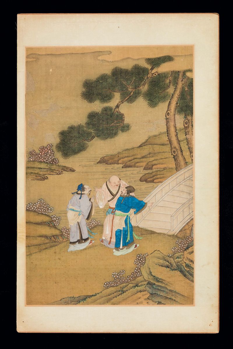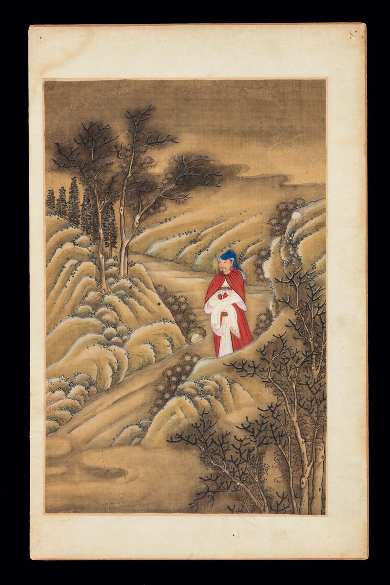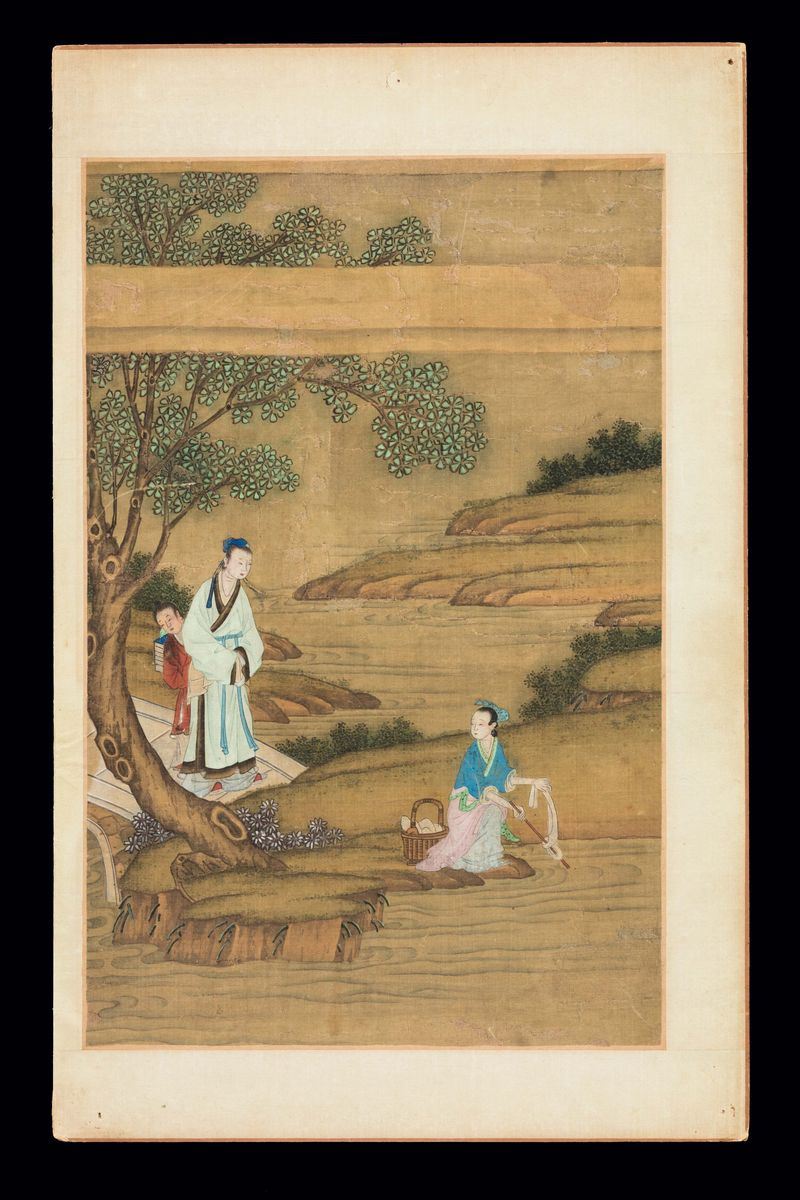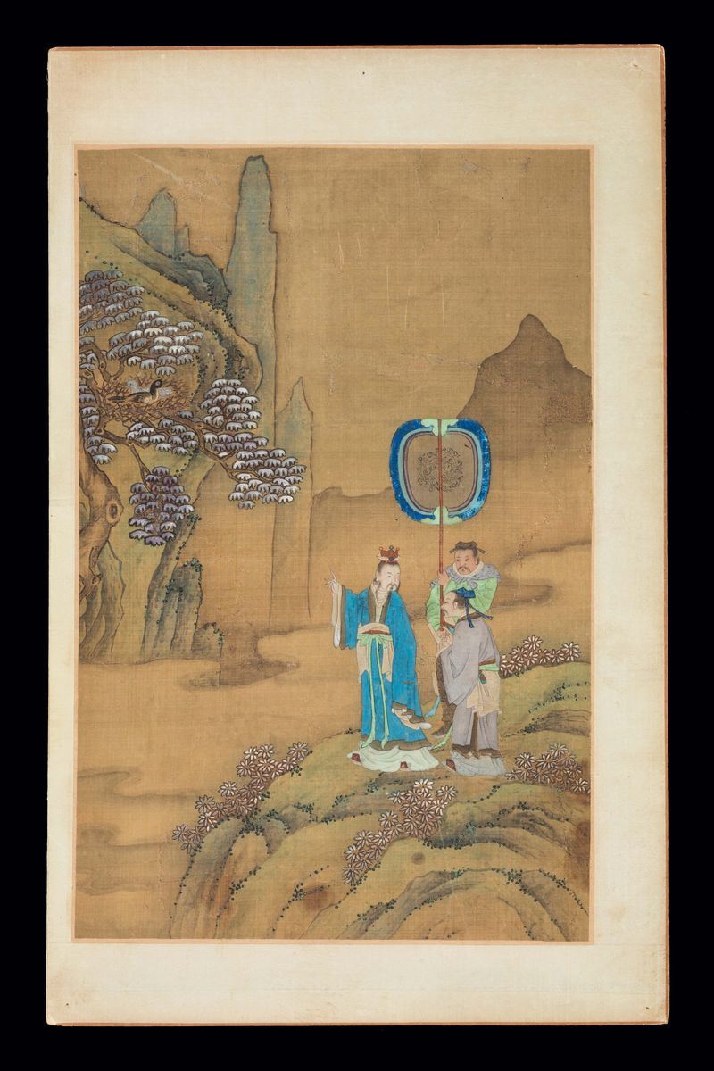 Five paintings on silk with common life scenes, wise men and dignitaries within landscape, China, Qing Dynasty, Qianlong [..]
