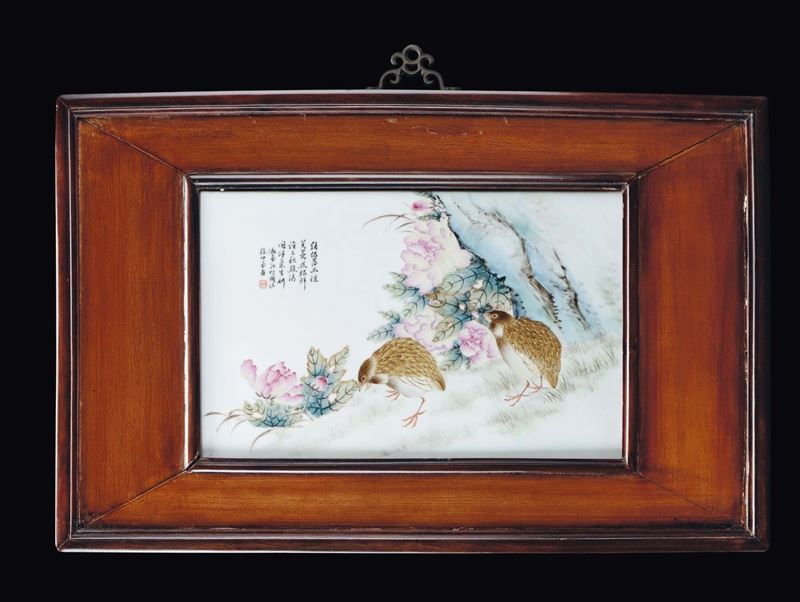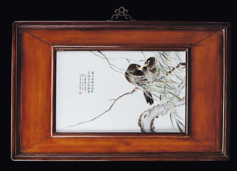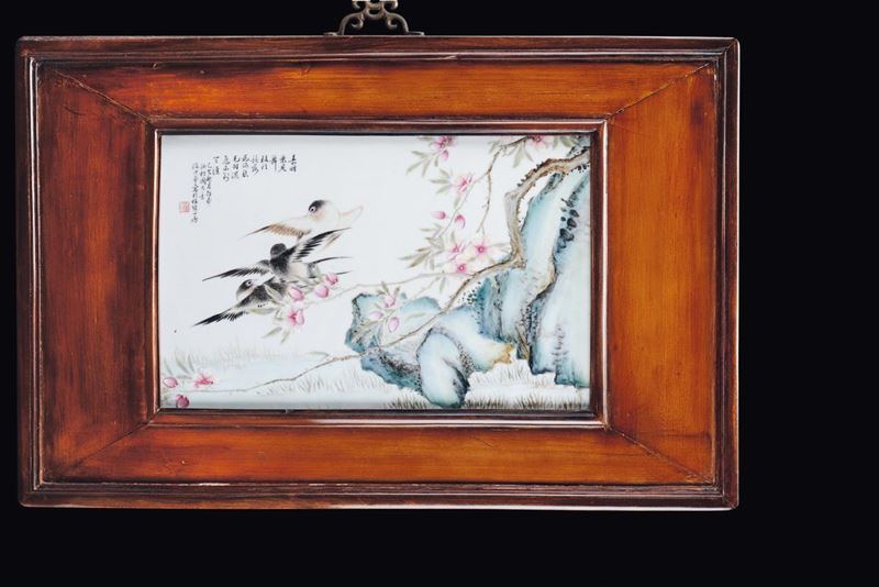 Four polychrome enamelled porcelain plaques with birds and inscriptions, China, Qing Dynasty, 19th century