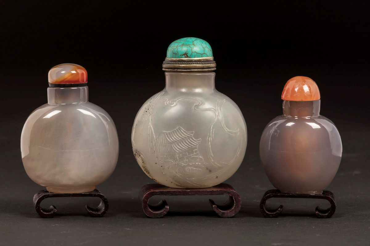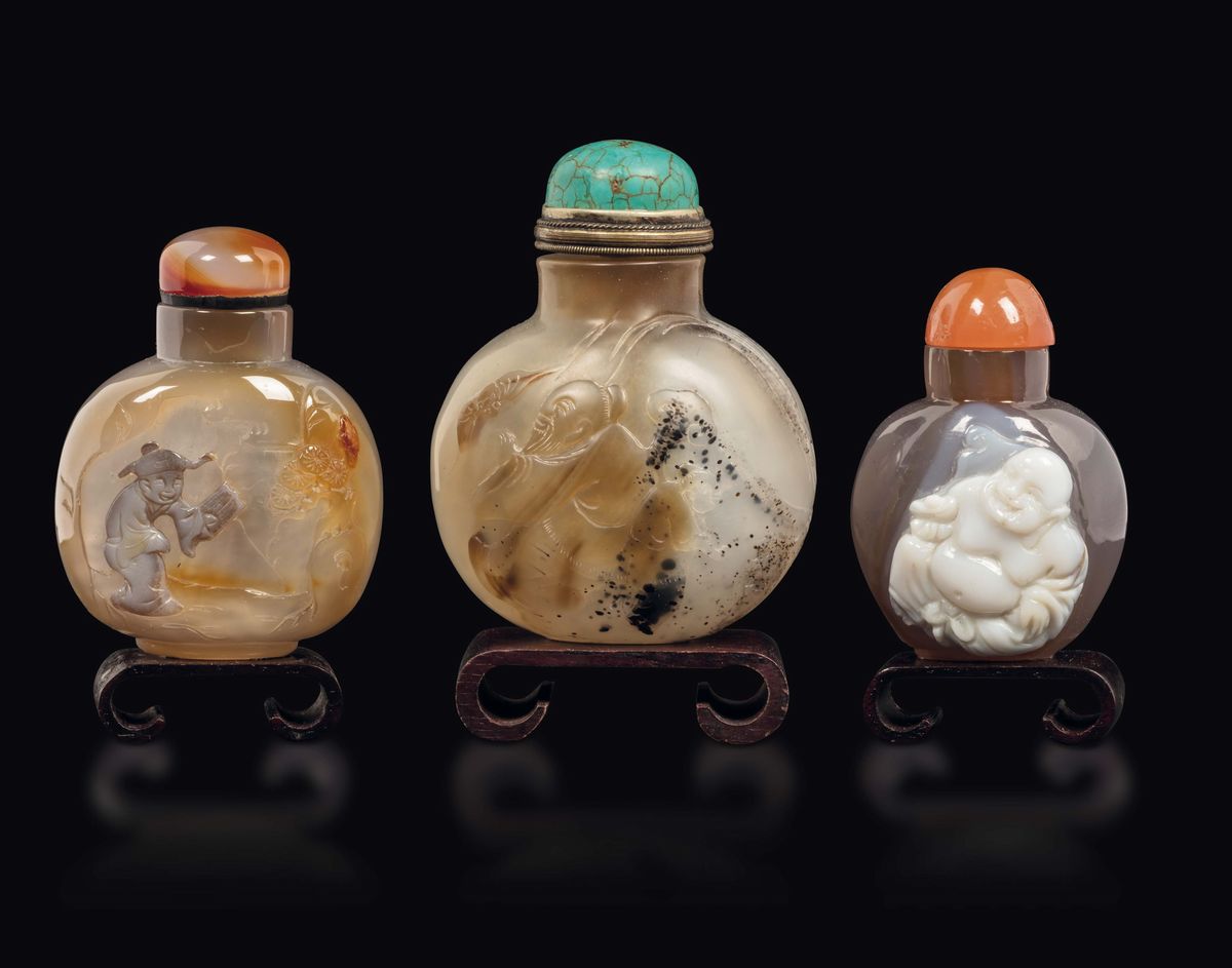 Three agate snuff bottles with wise men and Budai, China, Qing Dynasty, 19th century