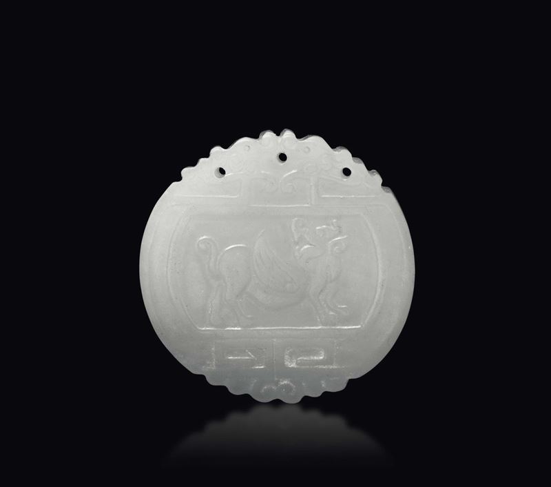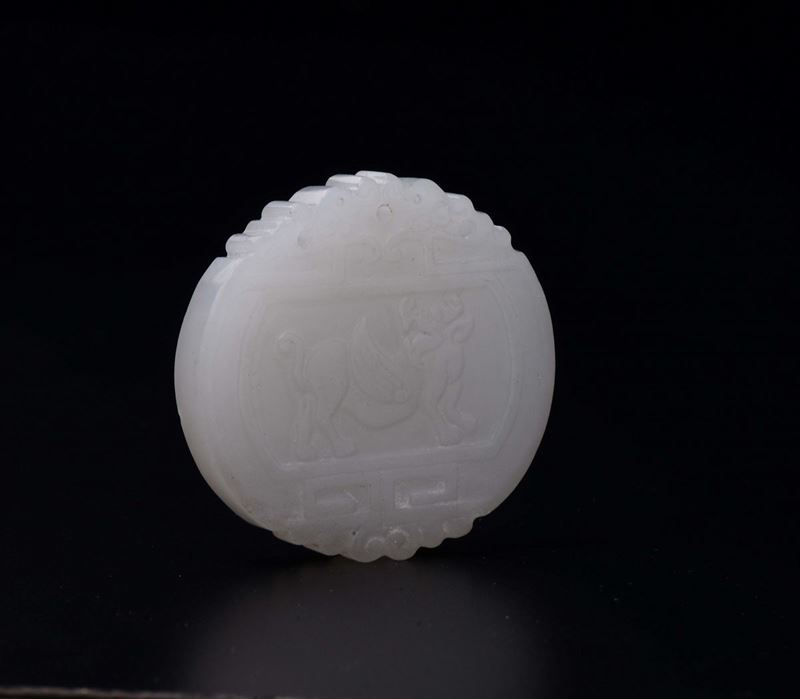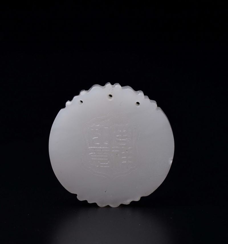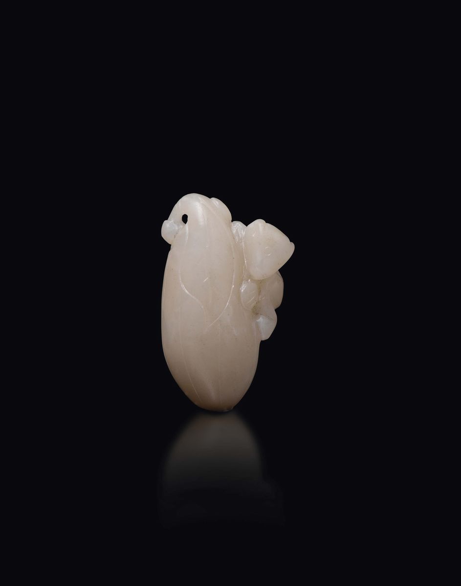 Three carved and fretworked white jades: a small fruit with an animal, a butterfly plaque and a pendant with inscription, [..]