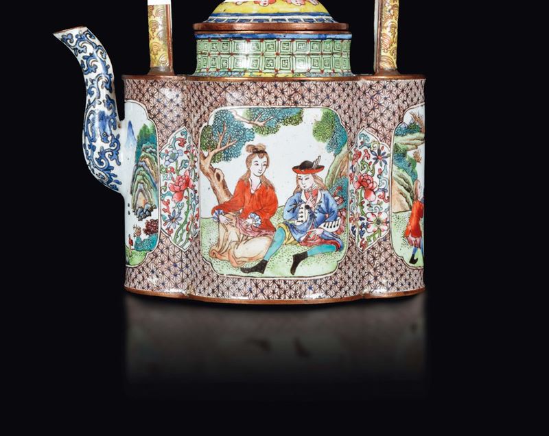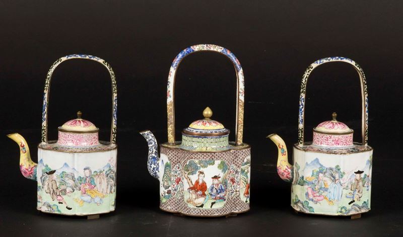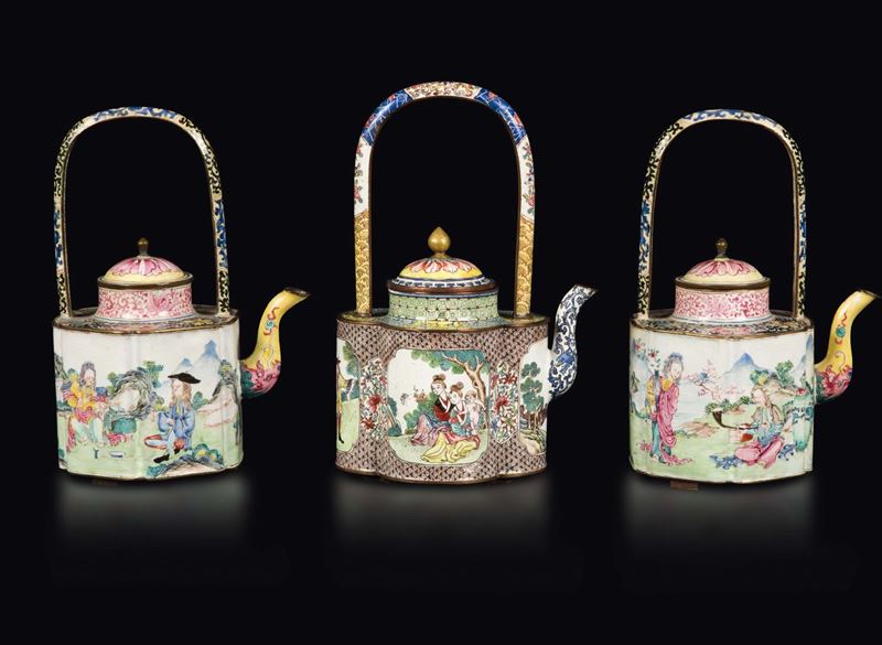 Three cloisonné enamel teapots with European subjects, China, Canton, Qianlong Period (1736-1795)