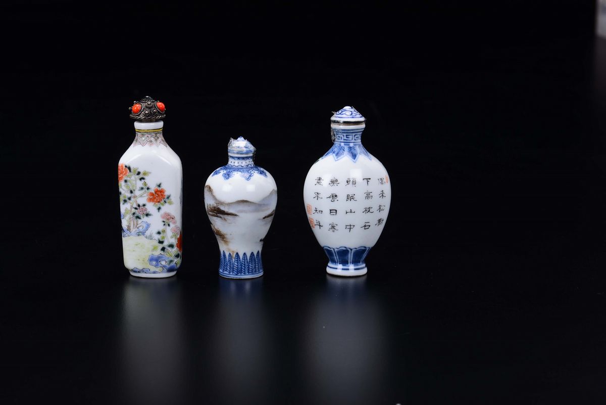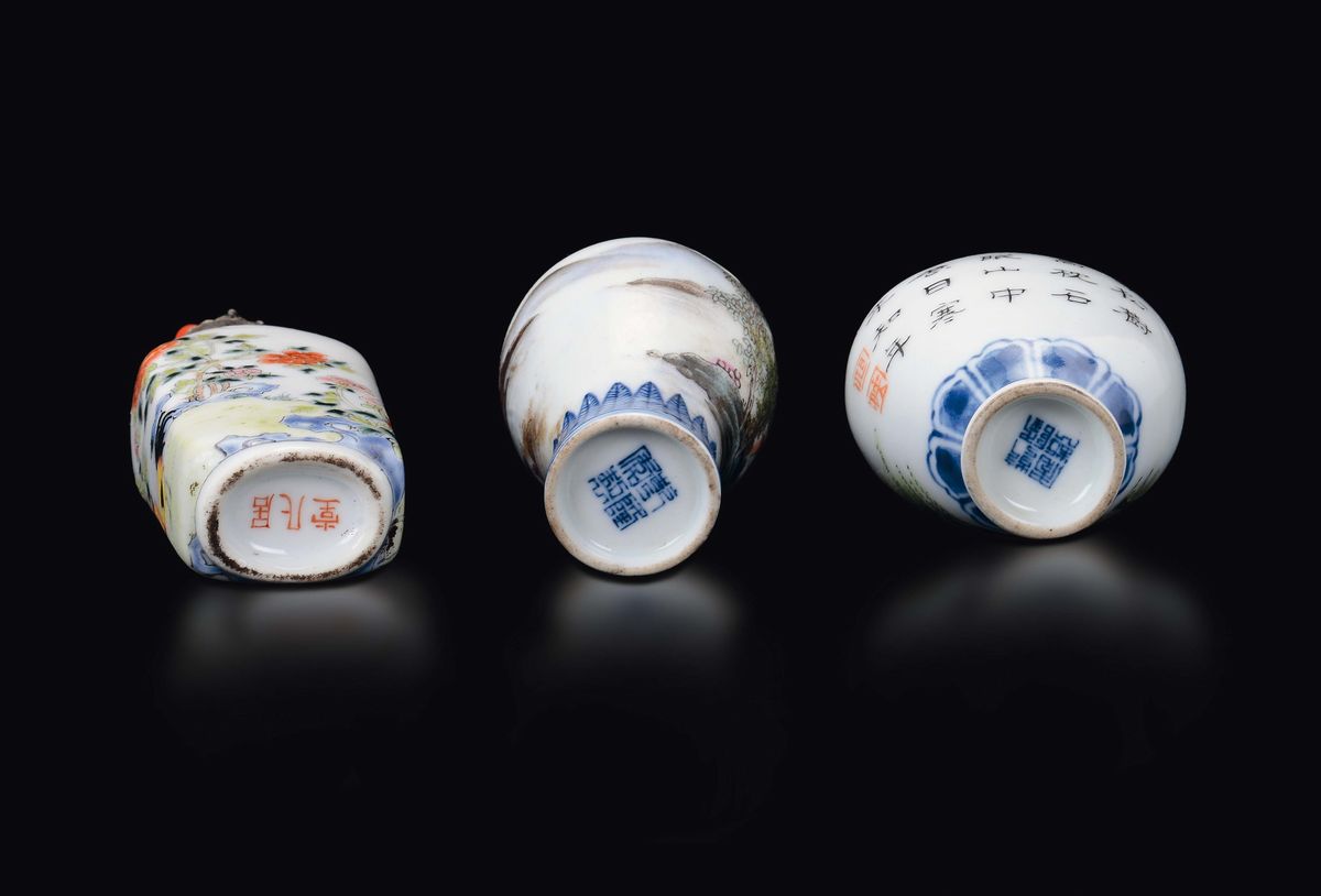 Three different polychrome enamelled porcelain snuff bottles with figures and inscriptions, China, Qing Dynasty, 19th cen [..]
